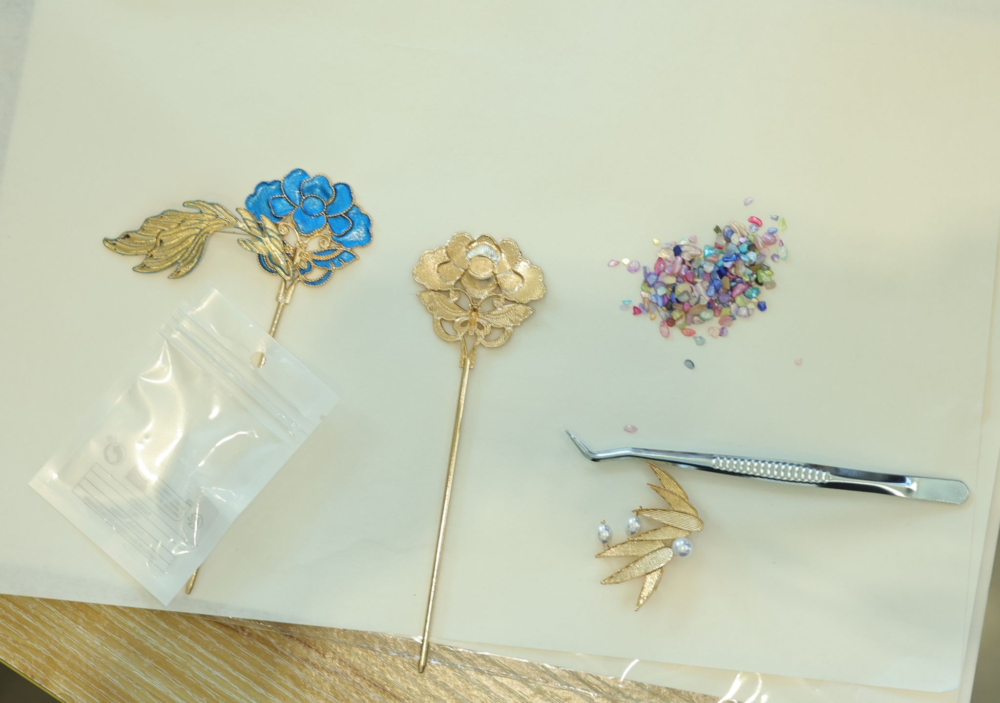 点翠是中国古老且珍贵的传统工艺,始于汉代,兴于明清。匠人先以金银制成底托,再巧妙镶嵌翠鸟颈部及背部蓝色羽毛,成品色泽奇幻瑰丽且历久弥新。为践行生态保护理念,现代仿点翠改用环保材料替代珍禽羽毛。本次活动特别选用玉米皮、宣纸等材料,通过创新工艺再现传统美学的当代价值。这项承载千年文化记忆的技艺,不仅展现着古代匠人的超凡智慧,更寄托着人们对美好生活的永恒向往。