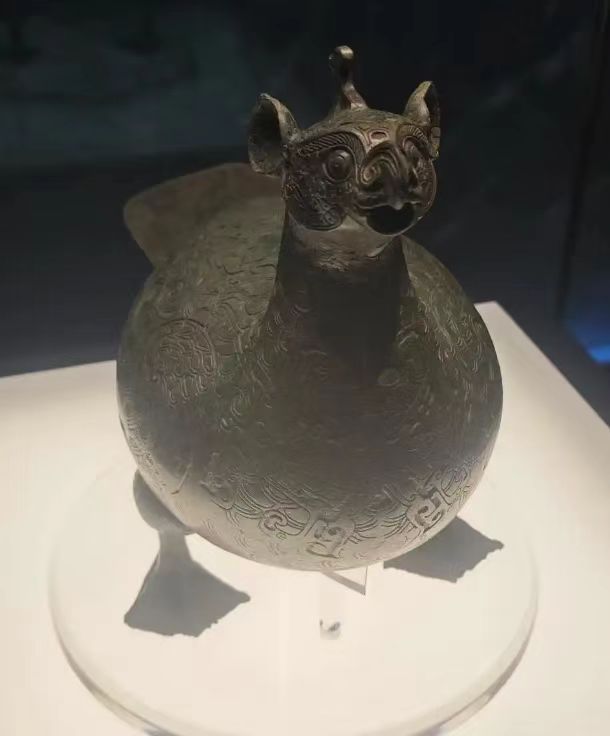 在二楼远古巴渝展厅,一件汉代青铜鸟形樽成为焦点。罗晓霞老师以历史学视野还原其功能:“这种祭祀礼器印证了巴蜀先民‘鸟崇拜’的文化特质,其铸造工艺更折射出汉代冶金技术的巅峰成就。”周杨老师则引导学生关注樽身纹饰的抽象变形手法:“兽面纹的几何化处理,展现了古人‘观物取象’的创造力。这种将自然意象转化为装饰语言的设计思维,至今仍是艺术创作的灵感源泉。”