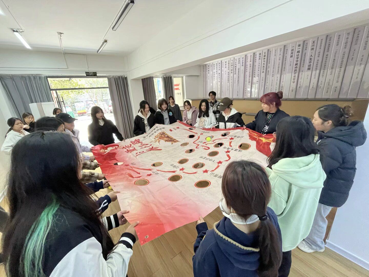 接下来,姜丽老师带领学生参观北山书院的“长征回忆录”活动室。走进活动室,学生们仿佛穿越时空,感受到了长征精神的磅礴伟力。随即,活动现场化身"微型长征路",一幅以红色为主色调的巨型长征路线图震撼亮相。地图标注出瑞金出发地、遵义转折点、泸定桥等24个关键节点,设置"血战湘江""飞夺泸定桥""翻越夹金山""胜利会师"等关卡。参与者以6人小队形式参与挑战,分为三小组比赛,走完长征路时间最短的小组为最终胜利组。通过长征活动,将党史知识融入趣味环节。学生们纷纷表示,在“重走小长征”模拟活动中感受到了红军行军的艰辛与不易。这种寓教于乐的方式更符合青年认知特点,能够增强学习的主动性和记忆深度。