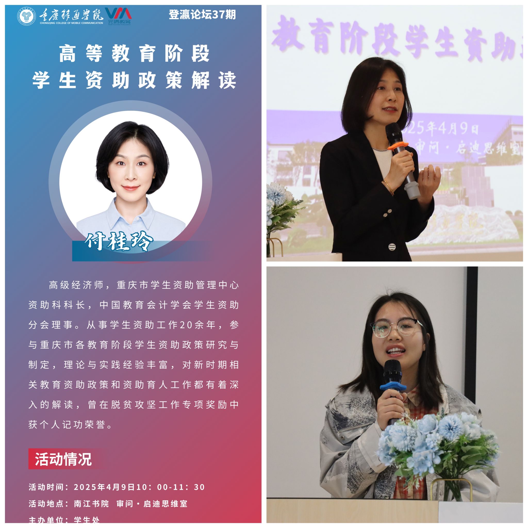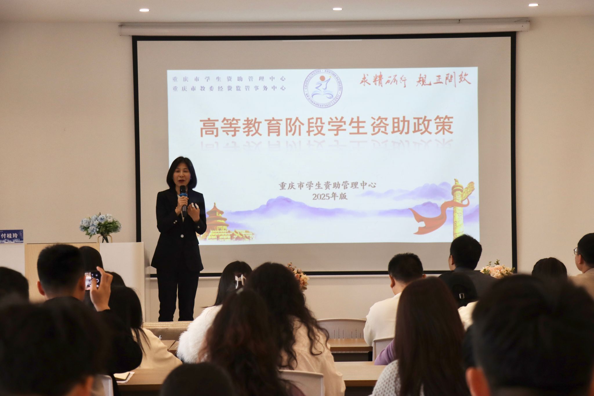 会上,付桂玲老师围绕国家及重庆市学生资助政策体系,针对各类奖学金、国家助学贷款、家庭经济困难学生认定、国家助学金、服兵役学生学费资助、勤工助学、暑期困难生走访慰问等资助项目,从时间安排、申请条件、办理流程及注意事项等方面进行了详细解读,以生动、具体、深刻的真实案例深入浅出地讲解了政策要点,并特别强调资助工作要坚持“公平、公正、公开”原则,同时注意保护学生个人隐私信息,确保每一份资助真正惠及有需要的学生。