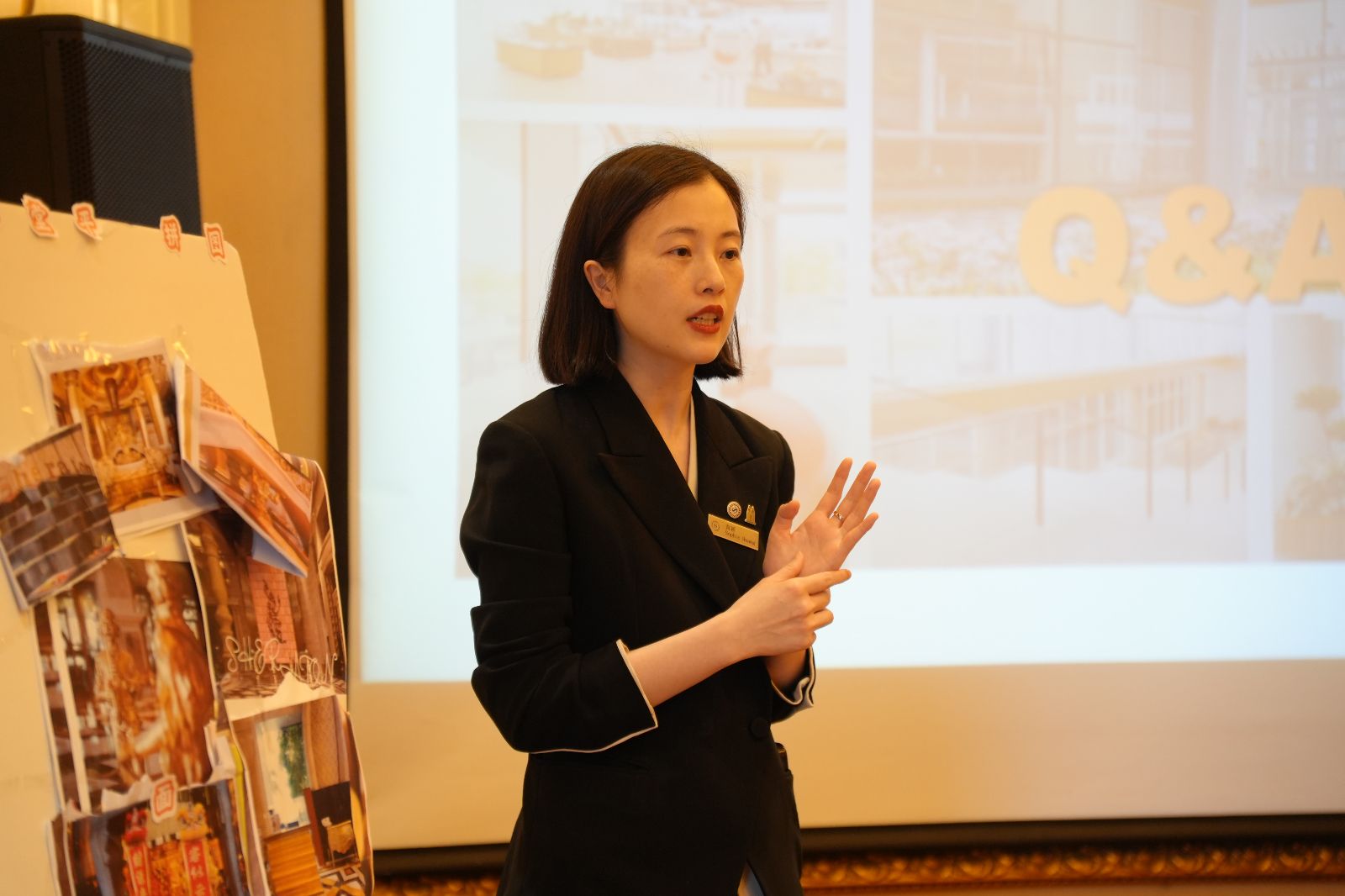 重庆喜来登大酒店作为万豪国际集团旗下高端酒店品牌,成为同学们了解行业前沿、链接职场实践的重要窗口。重庆喜来登大酒店总经理刘晶首先致辞,对师生的到来表示热烈欢迎,也希望同学们在本次的参观实践中有所收获,为未来提供方向。紧接着,喜来登大酒店培训负责人Abby通过图文与视频,系统讲解万豪集团全球布局、品牌矩阵及可持续发展战略,详细介绍了万豪集团的忠诚计划和喜来登的品牌定位,并以数据为支撑,剖析了酒店差异化服务、会员体系创新及本土化运营的成功经验,令在场学生对国际酒店管理模式有了更深刻的理解。