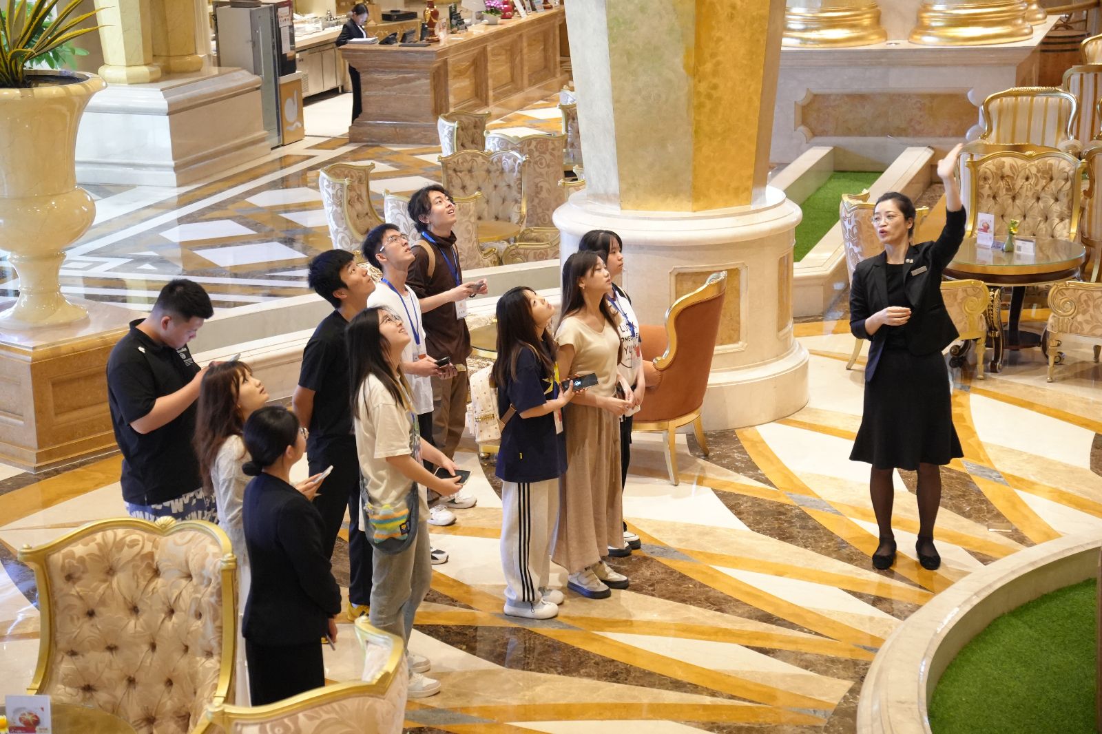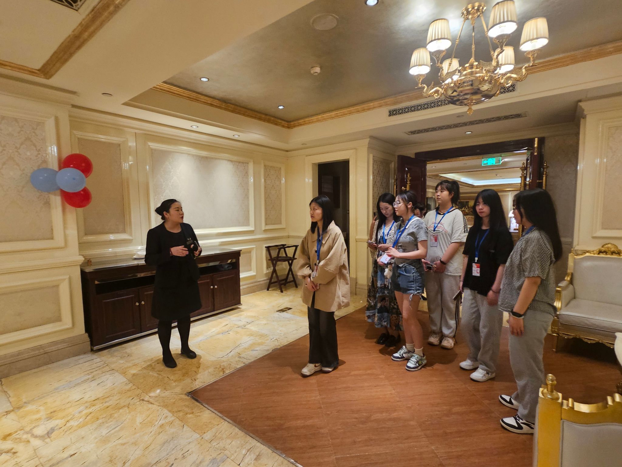 师生依次参观了酒店的前厅部、餐饮部和客房部。并由各部门负责人实地讲解酒店运营知识。在餐饮部,师生们参观了酒店全日餐厅、大堂吧、宴会厅及中餐厅。酒店全日餐厅规模宏大,布置精致;宴会厅内,灯光与花艺设计凸显空间美学;中餐厅则以欧式装潢风格融合中式餐饮文化,展现国际化服务理念。酒店工作人员详细讲解各区域功能定位及服务标准。
