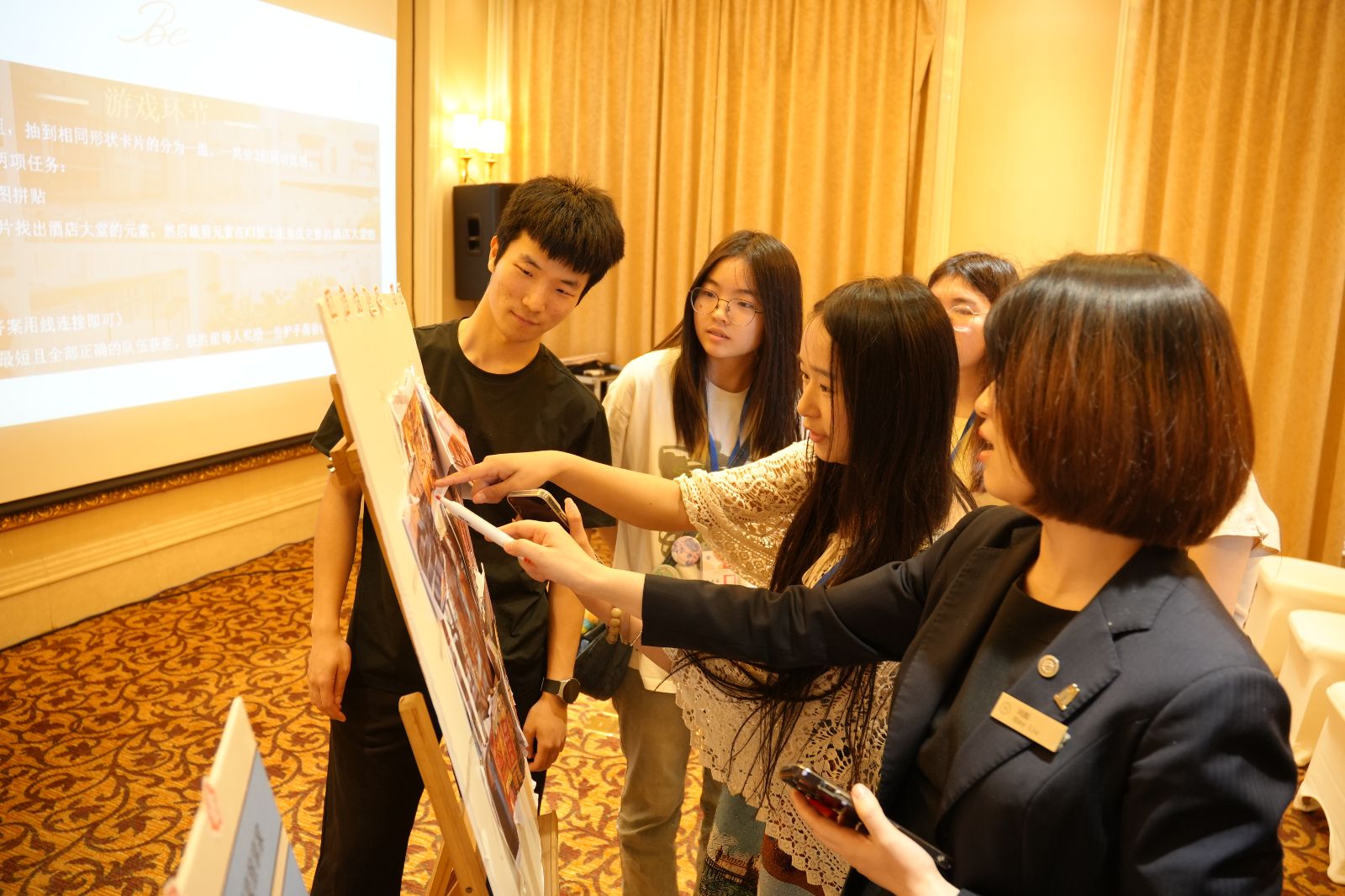 喜来登大酒店特意为师生们准备特色茶歇,让师生们体验酒店餐饮特色。师生们参与酒店设计的趣味活动,在“海报拼图挑战”中,学生分组协作,通过拼接酒店宣传物料快速还原大堂平面图,考验团队默契与空间思维能力;“喜来登知识竞答”则以趣味连线形式,检验学生对酒店品牌历史、服务标准的掌握程度。活动现场气氛活跃,学生们在实践中巩固了对酒店运营的认知。