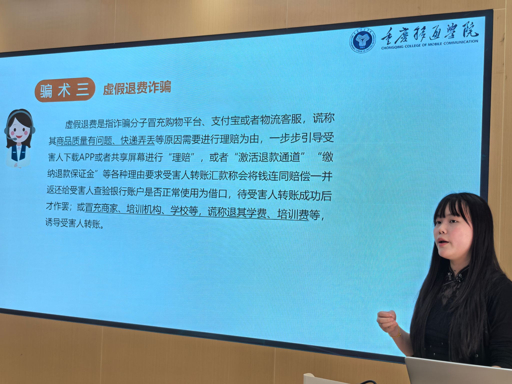 培训伊始,来自保卫处的罗倩老师以丰富的案例和专业的视角,开启了反诈知识的讲解,让异科导师全面了解常见的诈骗类型及其特点,包括网络诈骗、电信诈骗等,学会有效的反诈宣传方法和沟通技巧,能够生动、形象地向学生传授反诈知识,提高学生的学习兴趣和参与度。希望异科导师能够成为校园反诈的中坚力量,将所学的反诈知识和技能传授给学生,帮助学生提高防范意识,增强识别诈骗的能力,共同营造安全、和谐的校园环境。