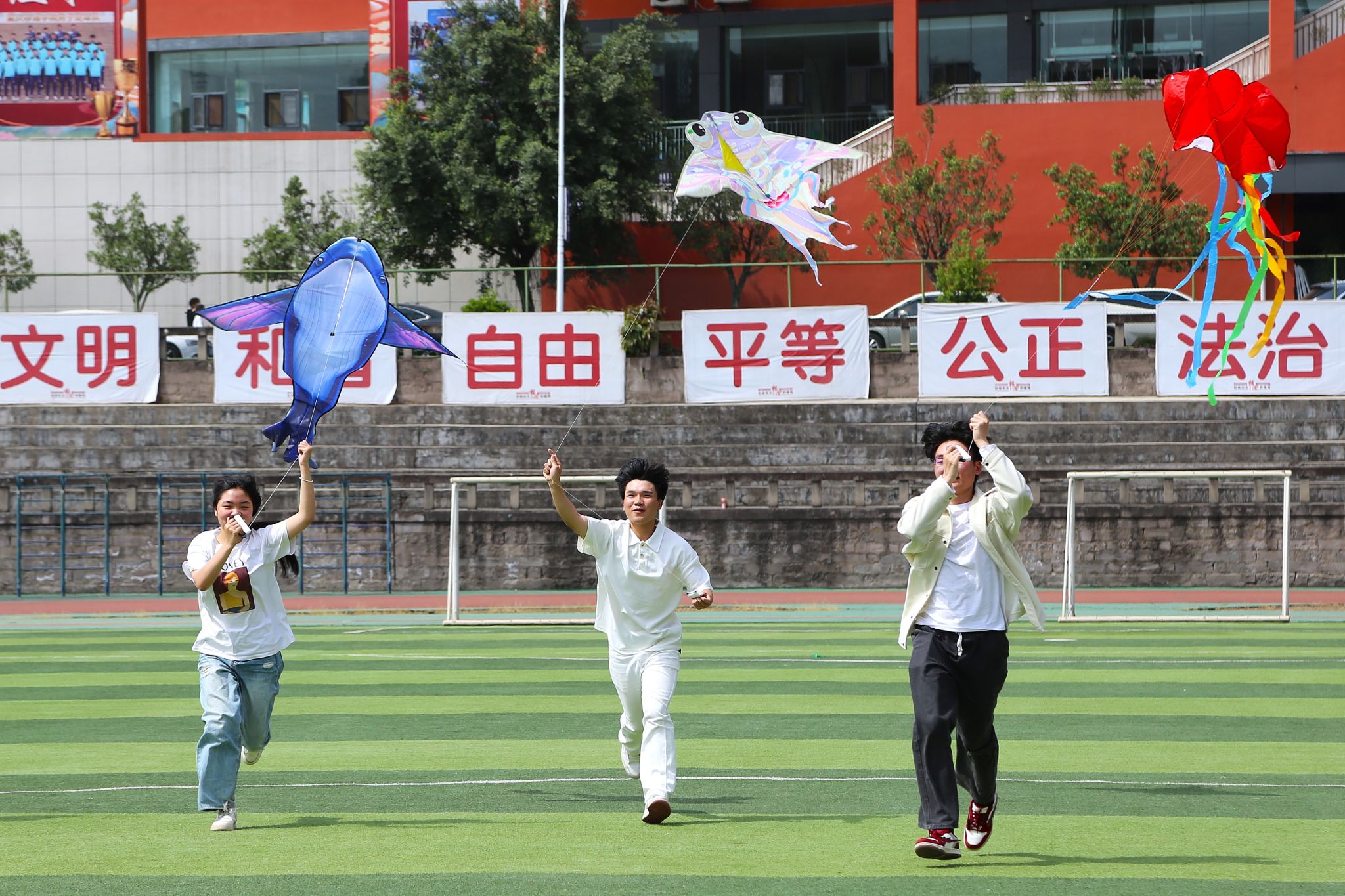 放飞风筝时刻到,同学们或手持自制风筝迎风奔跑,或与“筝友们”共同放飞大型风筝,互相合作,不断调整三角形特技风筝的牵引角度,传统民俗与现代校园文化在春风中交织碰撞。