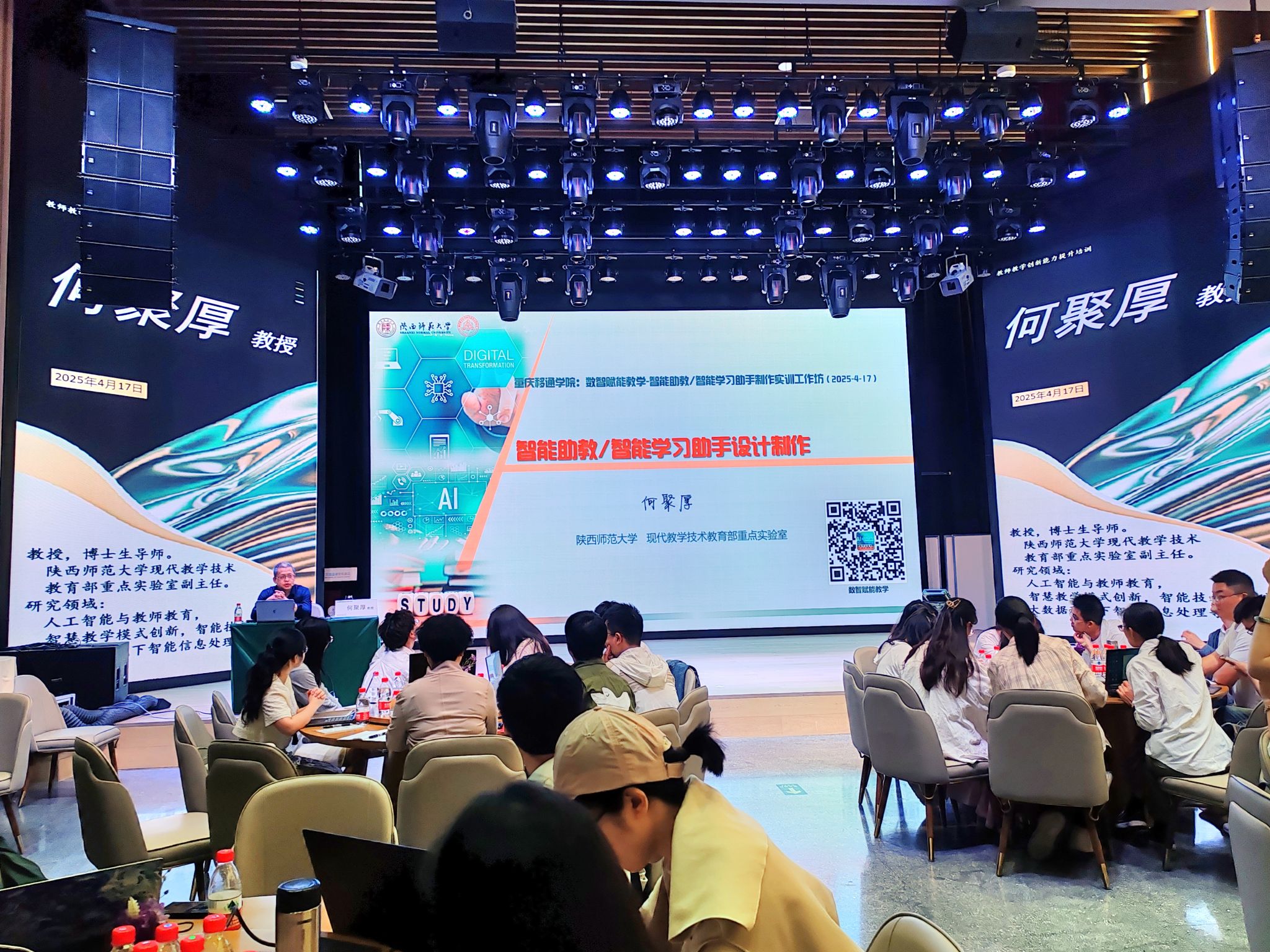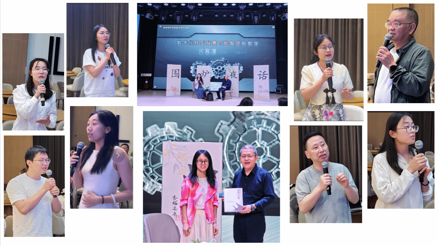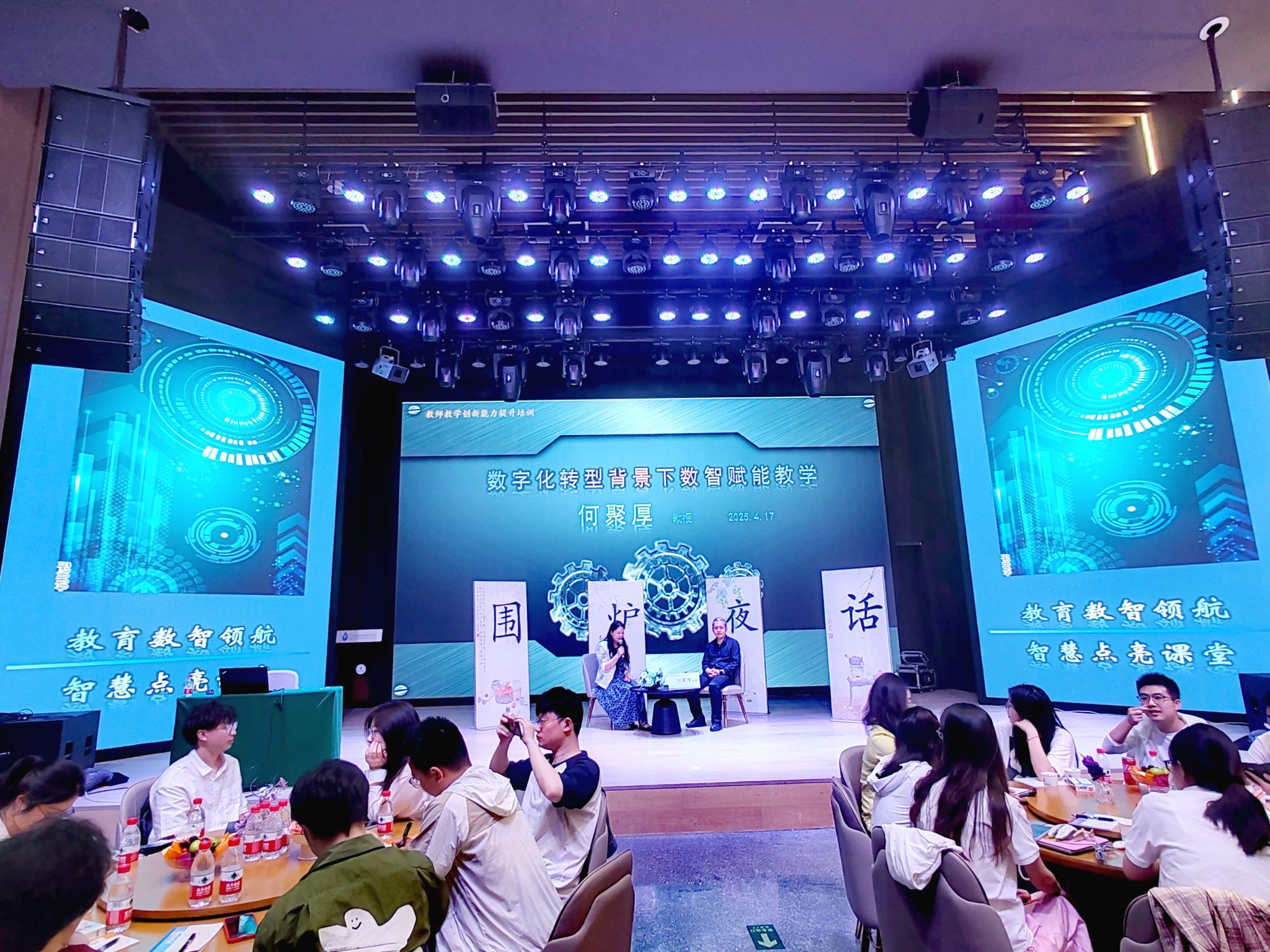 4月17日晚上19:00,何教授与参会教师们开展了“对话名师·共话成长”围炉夜话活动,以“数字化转型背景下数智赋能教学”为主题进行深入研讨。讨论的话题包括人工智能赋能教育的核心路径与实践探索、教育数字化转型的核心逻辑、大语言模型的教育应用边界、教育公平的技术实现路径、教师发展及院校支持体系等多个方面。参会教师们热情高涨、畅所欲言,思维的火花在交流中不断迸发,现场气氛热烈至极,充满了蓬勃的活力与激情。何教授对老师们的疑问做出了详尽的解答,如人工智能助教的选择与定位、人工智能技术使用方法的重要性、Al助教与教师的平衡发展、如何将智能助教贯穿教学全过程、如何解决Al技术快速迭代导致学习成果贬值的问题、如何解决Al助教错误传播风险等问题。