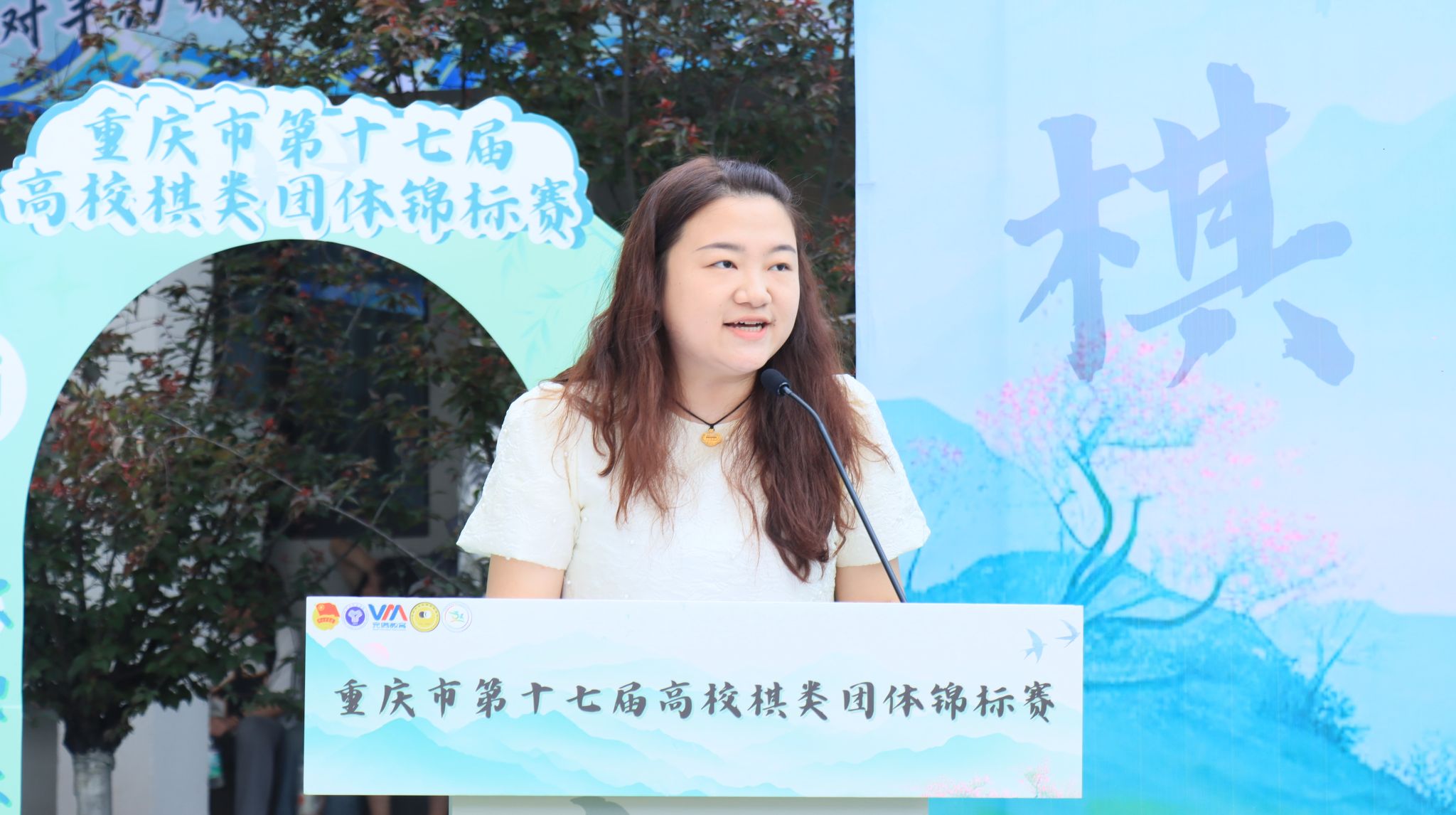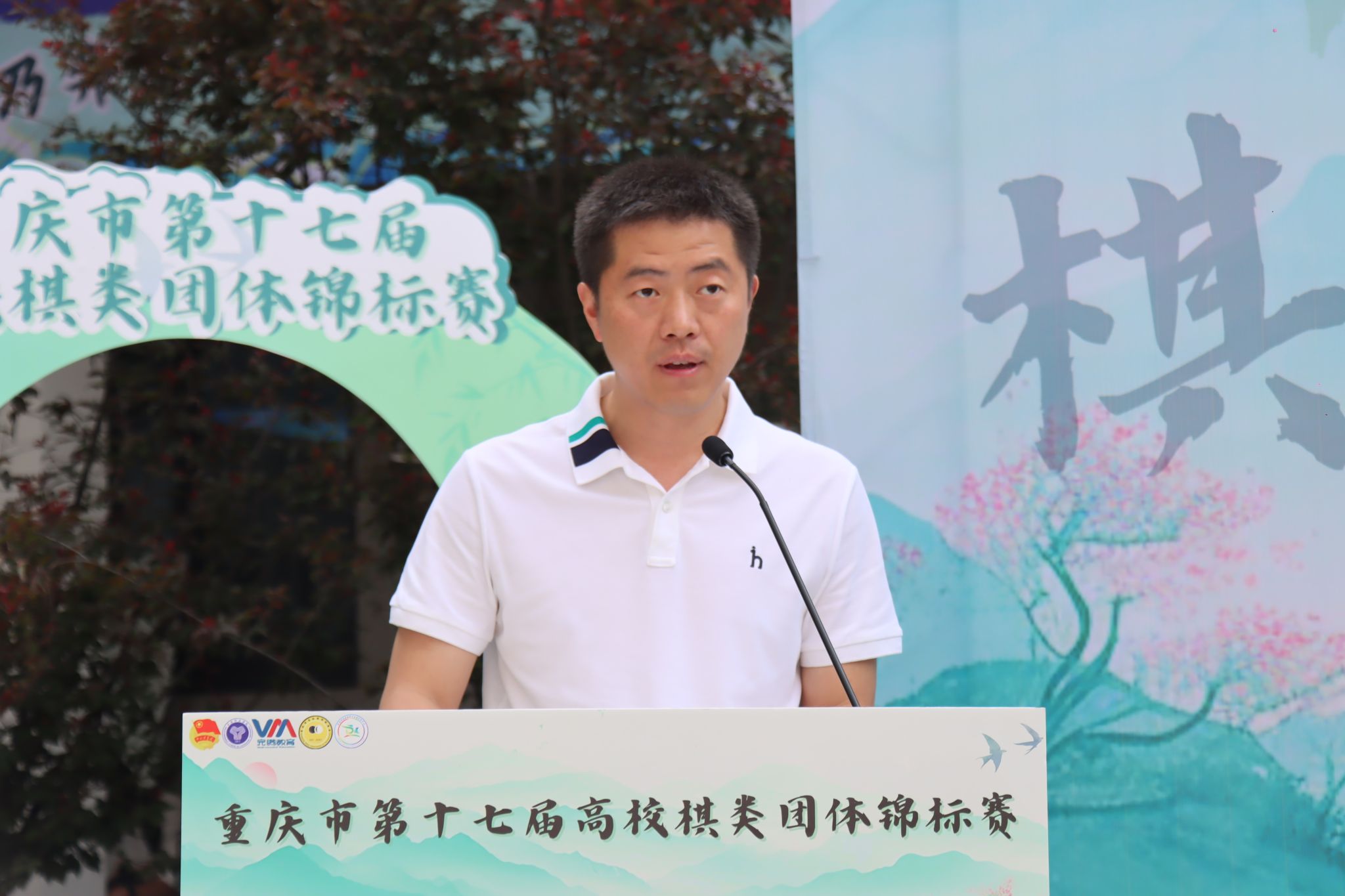 重庆市象棋协会副秘书长曹代春在致辞中强调:“棋类运动承载着中华民族五千年的哲学智慧,青年学子当以棋为镜,在博弈中锤炼‘谋定后动’的战略思维,培育‘和而不同’的文化胸襟。”