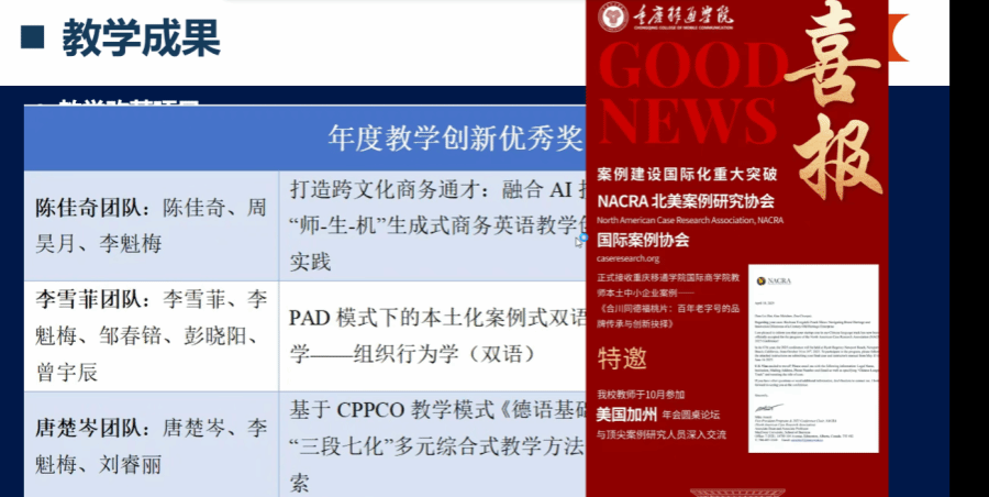 重庆移通学院綦江校区普镜旖老师汇报了本学期双语课程开设情况。她指出,学生反馈积极,参与度高,但在专业术语密集的课程中还存在理解挑战。合川校区国际商科教研室主任唐楚岑在会上对11门双语商科课程的实施进展进行了详细阐述,并介绍了Workshop教学模式在本学期的实践成效。她表示,相较于上学期,学生在该教学模式下的配合度有了明显提高。合川校区的郭美辰与王欣悦两位老师也分享了双语商科课程的教学经验与挑战,为参会者提供了宝贵的教学参考。