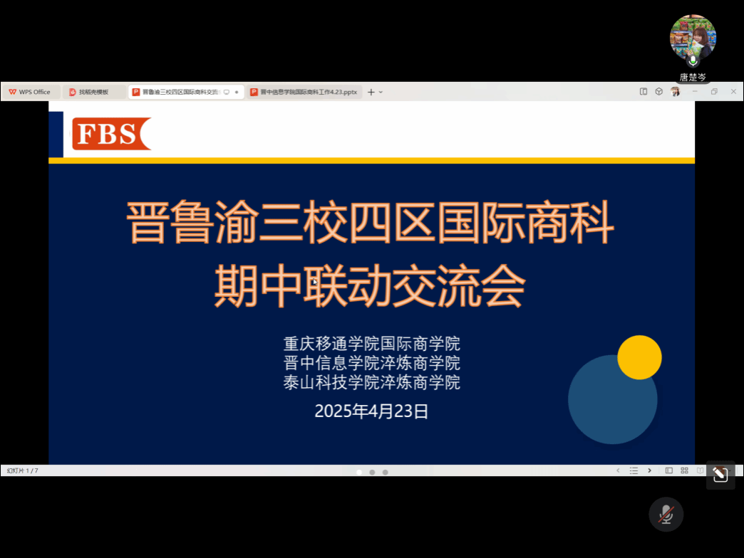 为进一步推动三校四区国际商科教育的发展,加强三校四区之间的交流与合作,4月23日,重庆移通学院国际商学院牵头召开了一场三校四区国际商科线上推进会。本次会议汇聚了来自晋中信息学院、泰山科技学院以及重庆移通学院綦江校区、合川校区的众多代表,共同探讨国际商科教育的创新与发展。