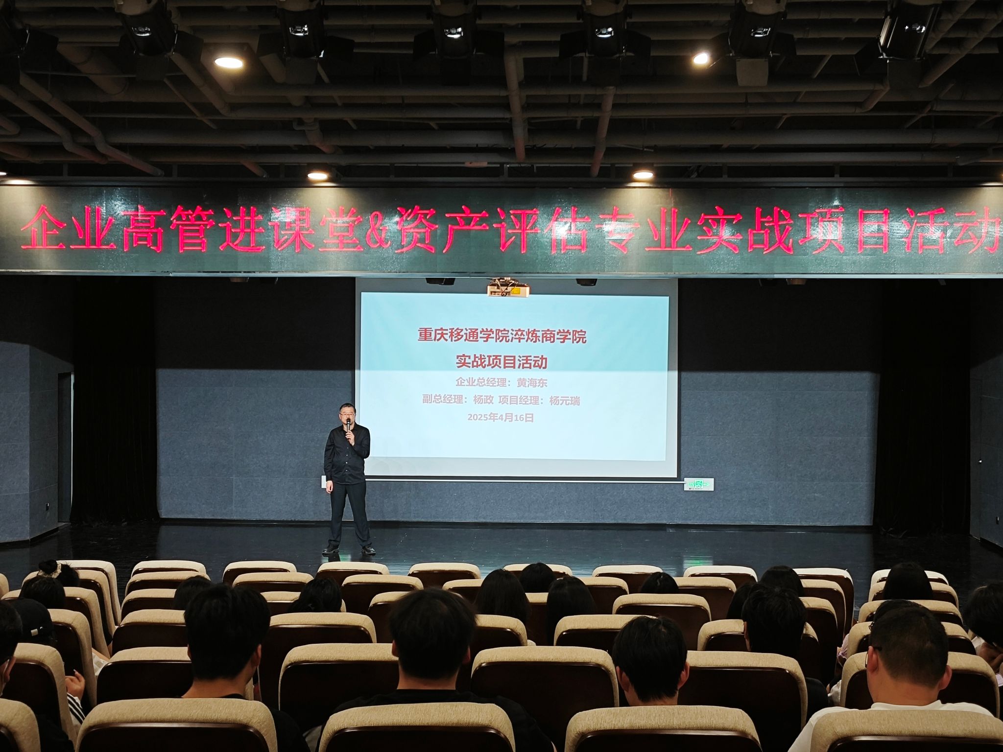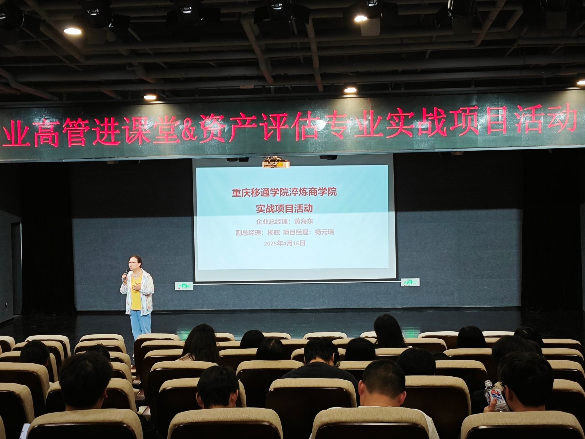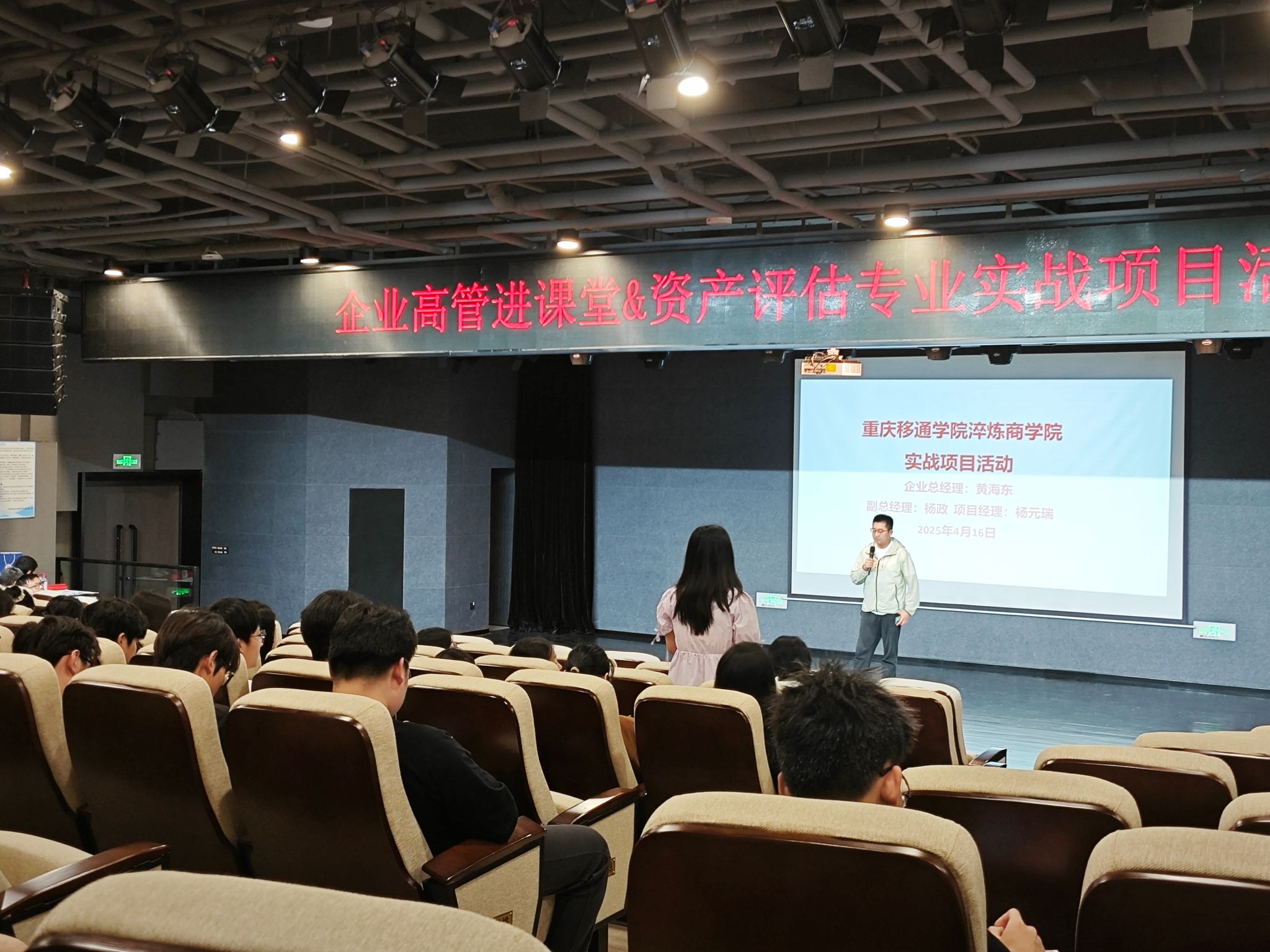 为深化产教融合,拓宽学生行业视野,4月16日,淬炼商学院资产评估课程开展了“高管进课堂”及专业实战项目活动。在活动上,全体师生迎来重磅嘉宾——重庆海渝资产评估房地产土地估价有限公司总经理黄海东、副总经理杨政及项目经理杨元瑞,为同学们带来了一场干货满满的行业分享,搭建起理论知识与实践应用的桥梁。
