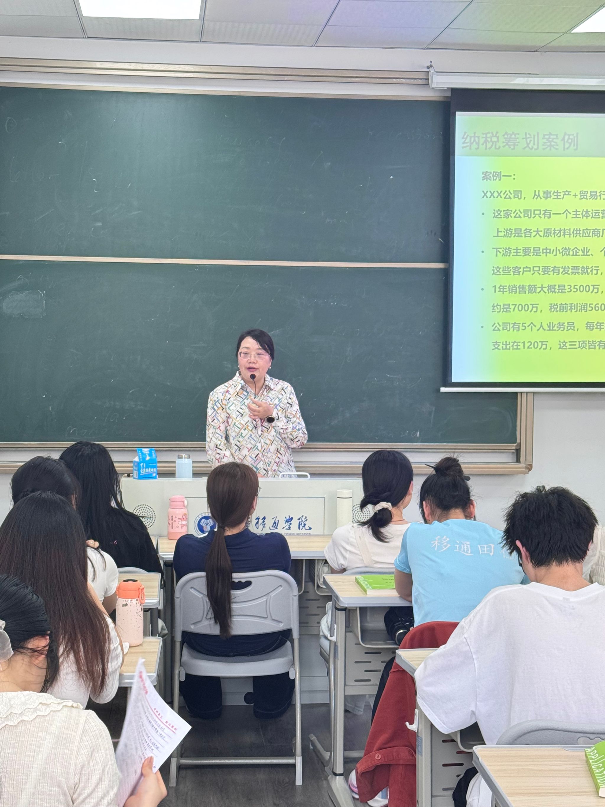 活动中,邹燕老师从财务价值与税收来源出发,结合当前税收政策的变革趋势,详细解读了税收筹划的风险、特征以及有效的防范措施。结合企业实际运营场景,分享了多个经典纳税筹划案例,如通过合理利用区域税收政策实现节税,以及在企业重组并购过程中如何进行税务筹划以降低成本。这些真实案例生动展现了纳税筹划在企业财务管理中的关键作用,帮助同学们打破课本知识的局限,建立起从理论到实践的思维框架。