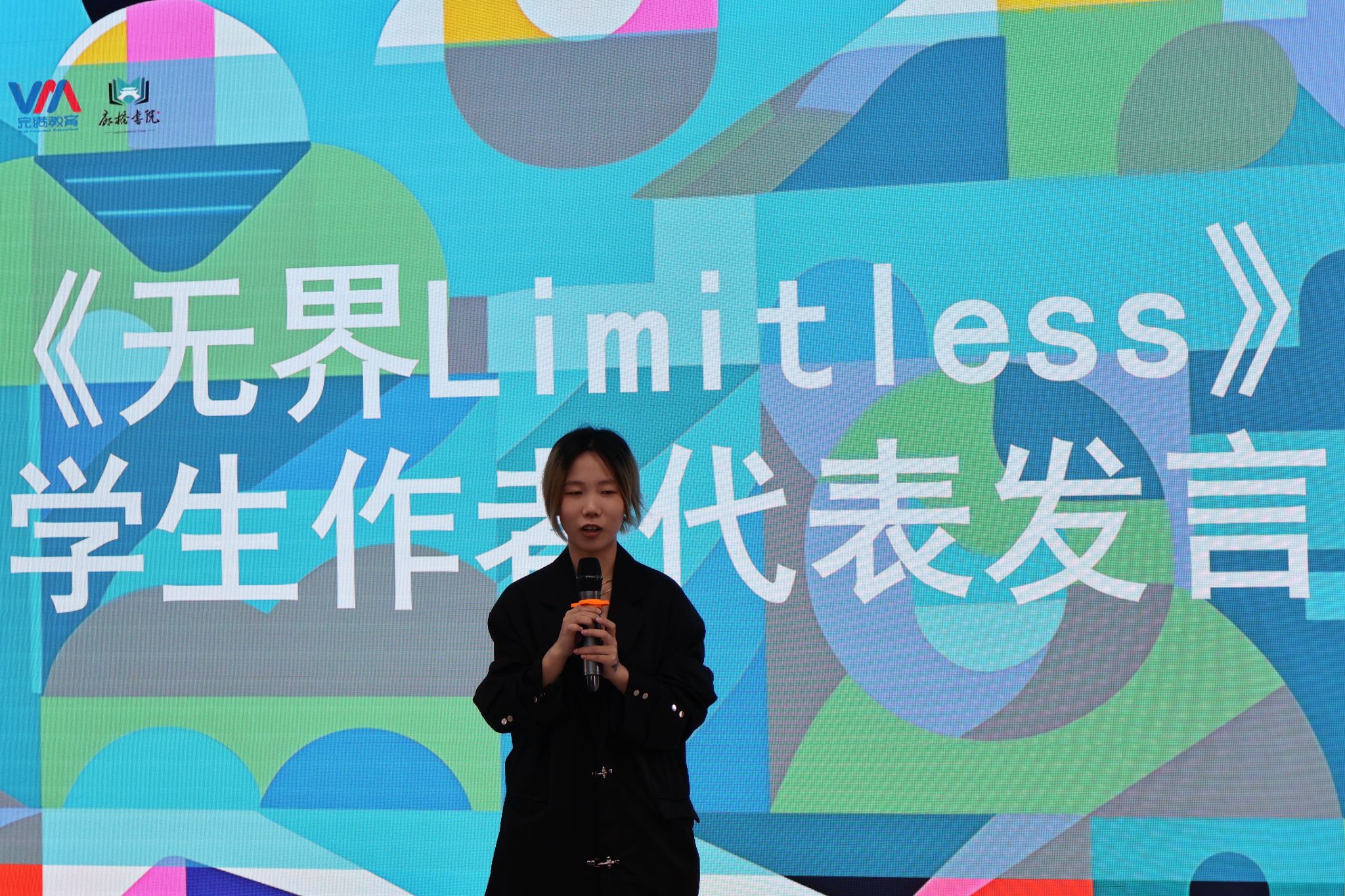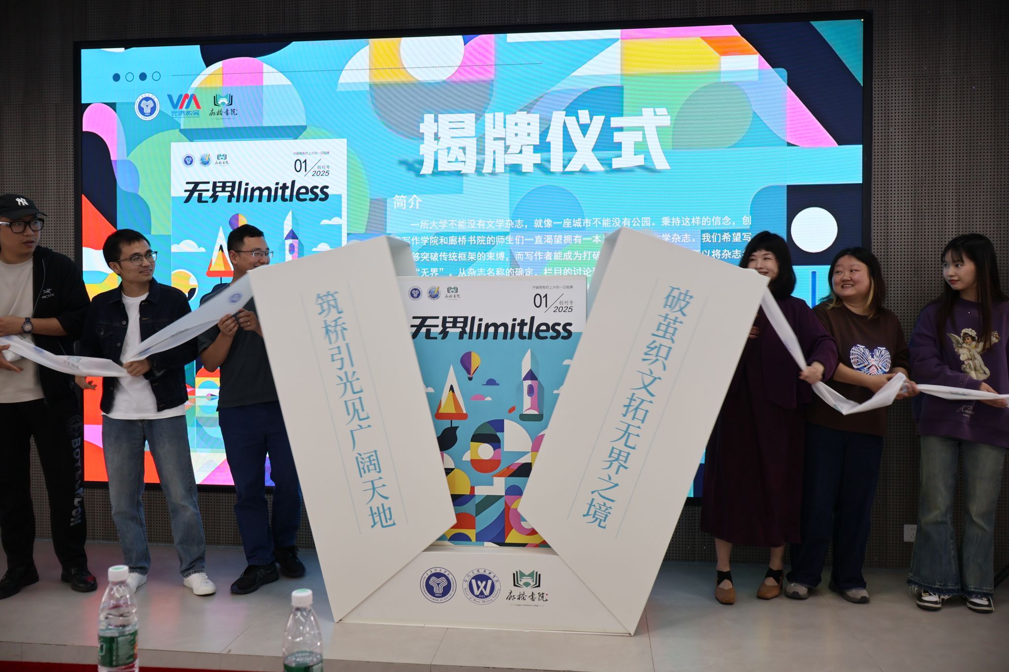 在揭牌仪式环节,吴帆、任绪军、王基胜等六位嘉宾共同为《无界Limitless》揭幕。随着倒数声落下,刊物的“神秘面纱”被缓缓揭开,现场掌声雷动。据介绍,《无界Limitless》首刊历时一年编撰,在夏曦、王基胜两位老师指导下,学生冷颖颖、赵静文、岑涓、郑凯文等同学共同协作下,由创意写作学院收录了20位学生作者的27篇作品,包括小说8篇、人物访谈1篇、剧本1部、散文3篇、诗歌14篇,展现了学生创作者从“独立写作”到“文化造梦人”的蜕变。