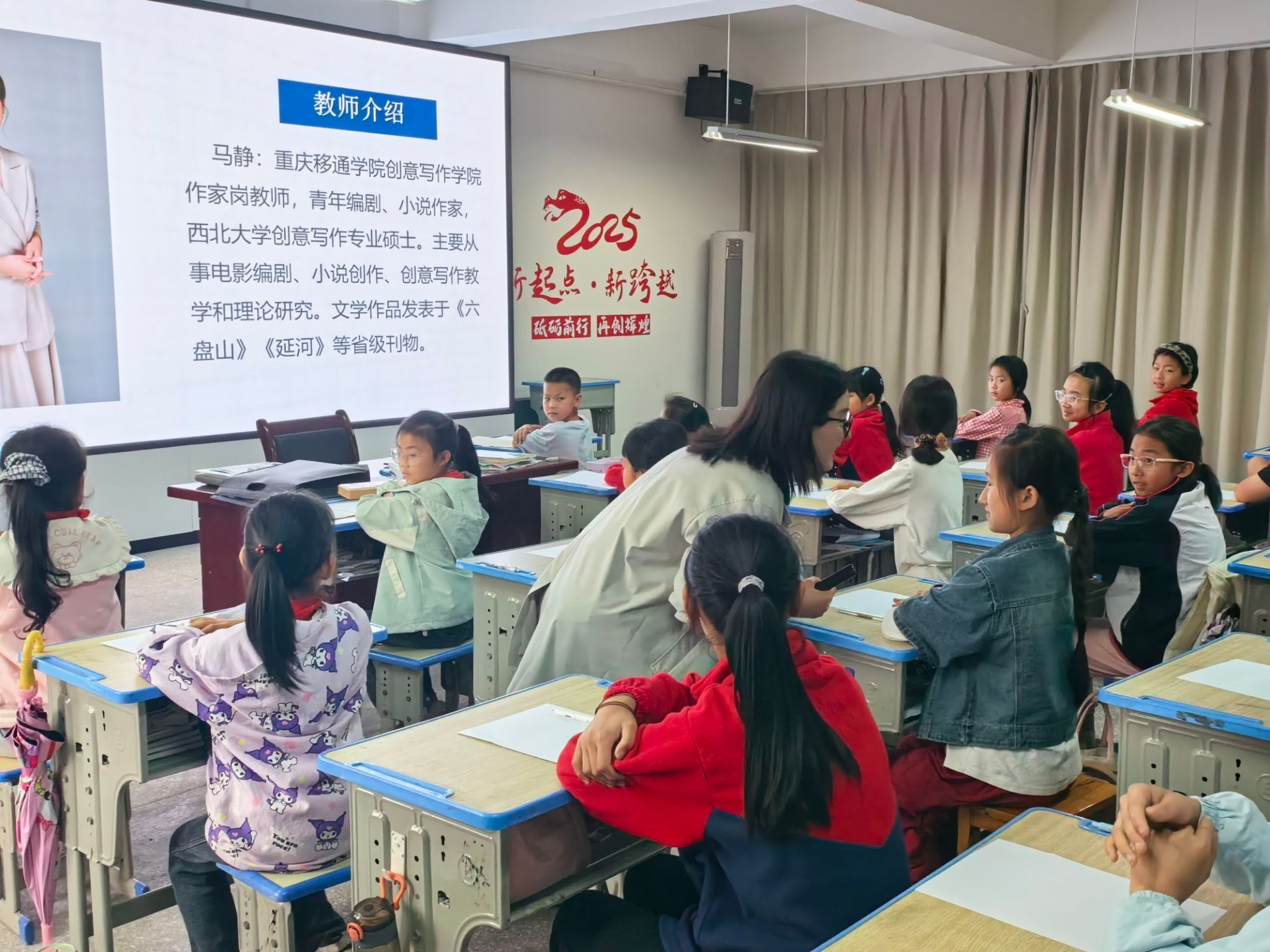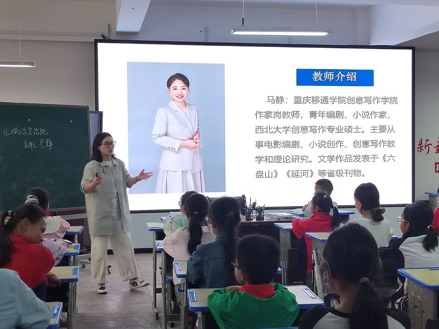 随后,马静老师也做了简短自我介绍。她现任重庆移通学院创意写作学院作家岗教师,拥有丰富的创作与教学经验。本次课程,她将结合自身专业所长,为孩子们打开人物描写的精彩世界。