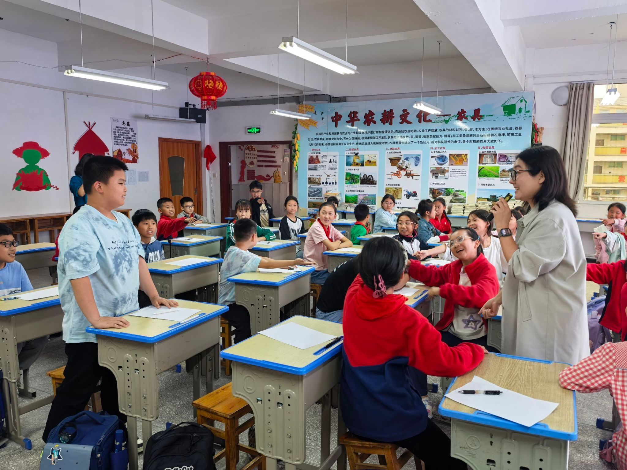 为了让孩子们更好掌握人物描写的方法,马静老师设计了“人物大侦探”游戏。马老师将一支笔交到第一排第一位同学的手中,让大家“击鼓传花”,接到笔的同学需要描述同班同学的外貌特征,而其他同学则根据线索进行猜测。这一环节既考验了孩子们的观察力,也锻炼了他们用语言细致描绘人物的能力。孩子们在游戏中逐渐掌握了抓住人物特点,如服装颜色、发型特征、惯用的动作、常说的话语等方面,课堂气氛轻松而充满欢笑。