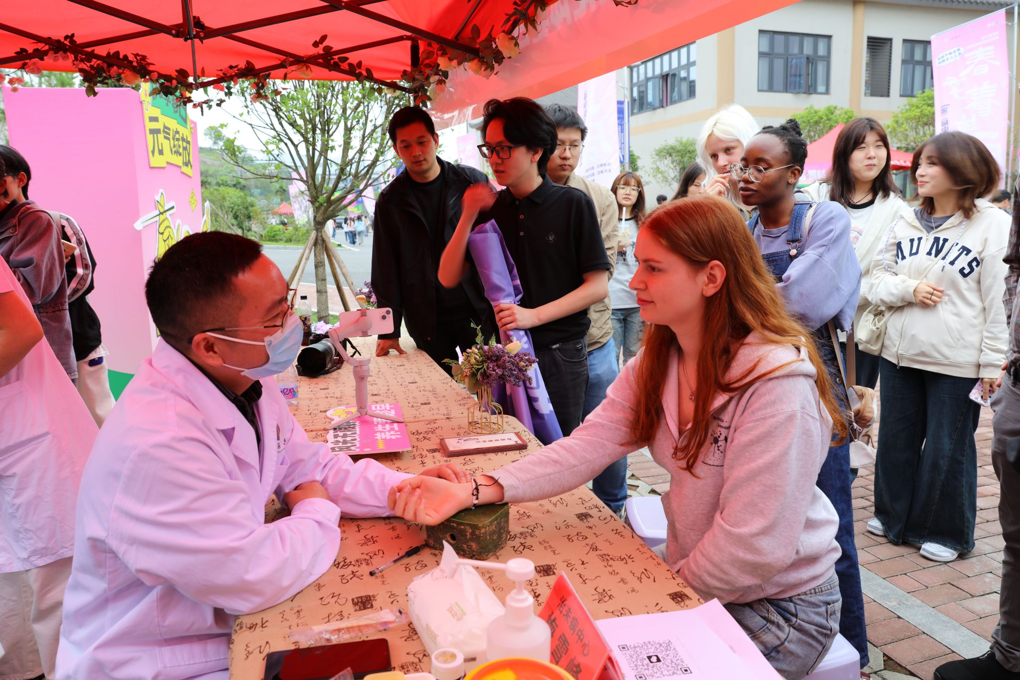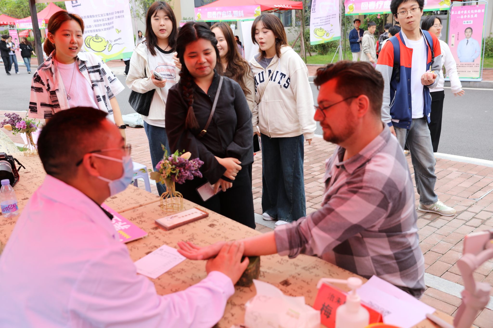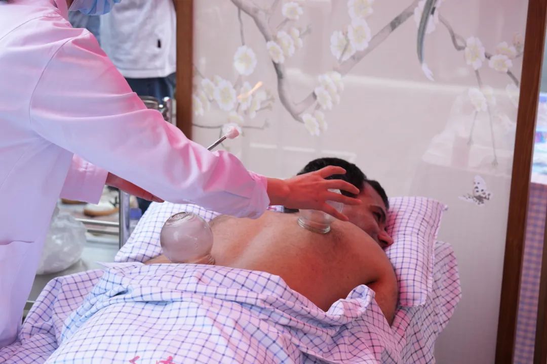 脉诊台前,专业医师三指轻搭德国留学生手腕,精准说出“近期偶有疲劳且食欲不振肠胃不消化”等细节,引得众人惊呼“中医像在和身体对话”。美国外教Peter主动“打头阵”体验针灸,银针入穴时感叹:“酸胀感像被羽毛轻触,奇妙又温和!”巴基斯坦外教Khan则体验了拔火罐项目,看着肩颈处的紫红色罐印,他笑称:“这像是给身体做了一场‘真空按摩’!”德国留学生Sarah则体验了艾灸项目。