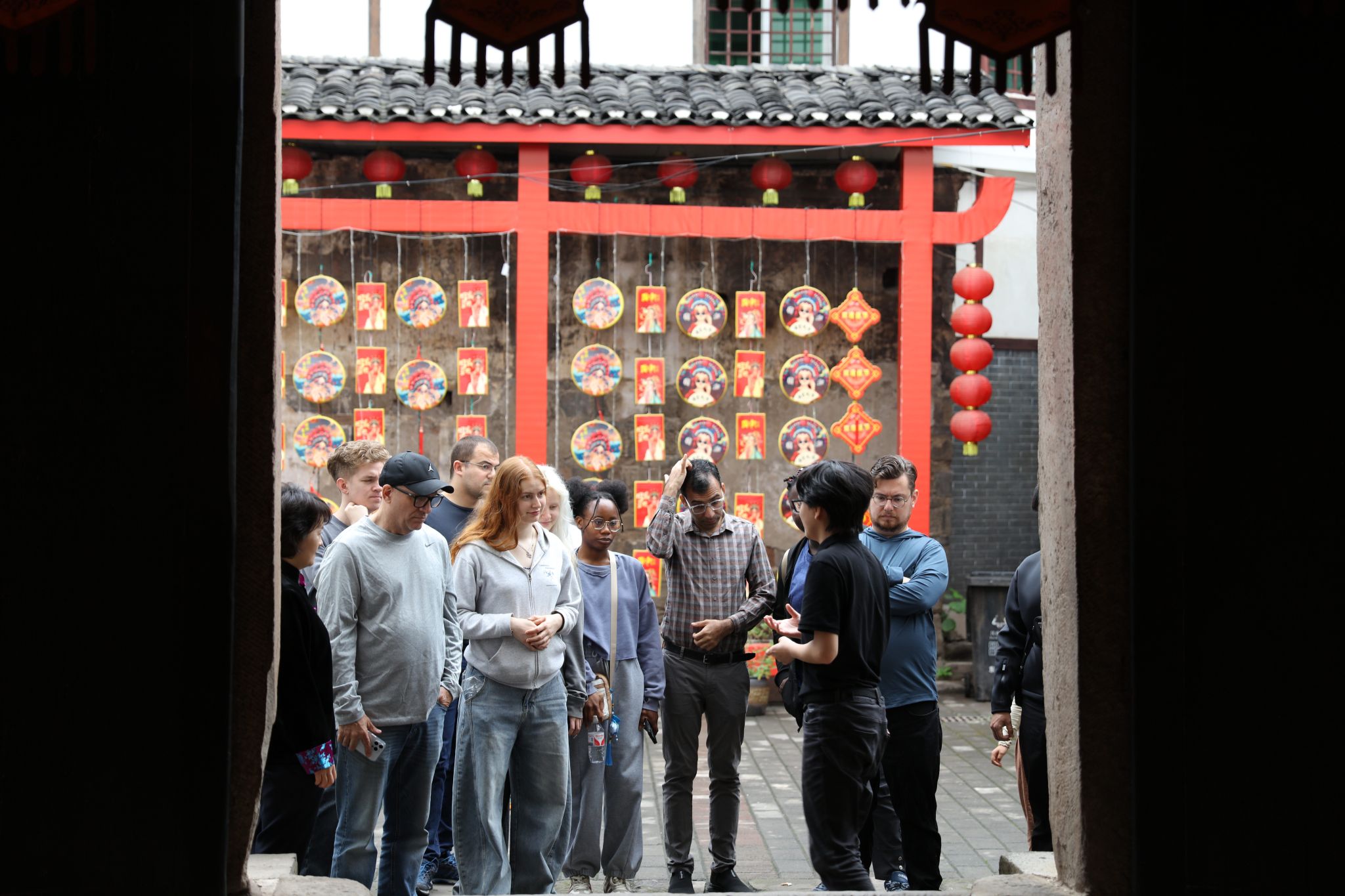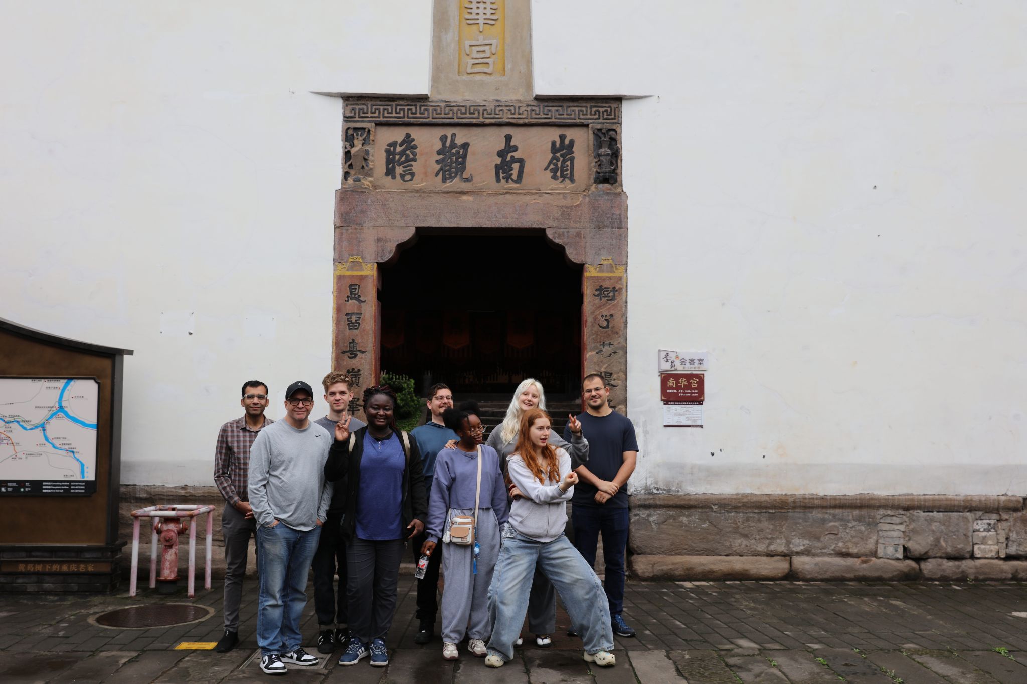 步行至南华宫,细雨中的青石板路更添古韵,这座始建于清乾隆年间的两广会馆内,戏台浮雕的上四大名著的人物栩栩如生,似在演绎剧中传奇。传统古建的雕梁画栋,正不断诉说着湖广移民的迁徙过往,师生们在门前合影,细雨轻敲芭蕉叶,仿佛穿越百年。