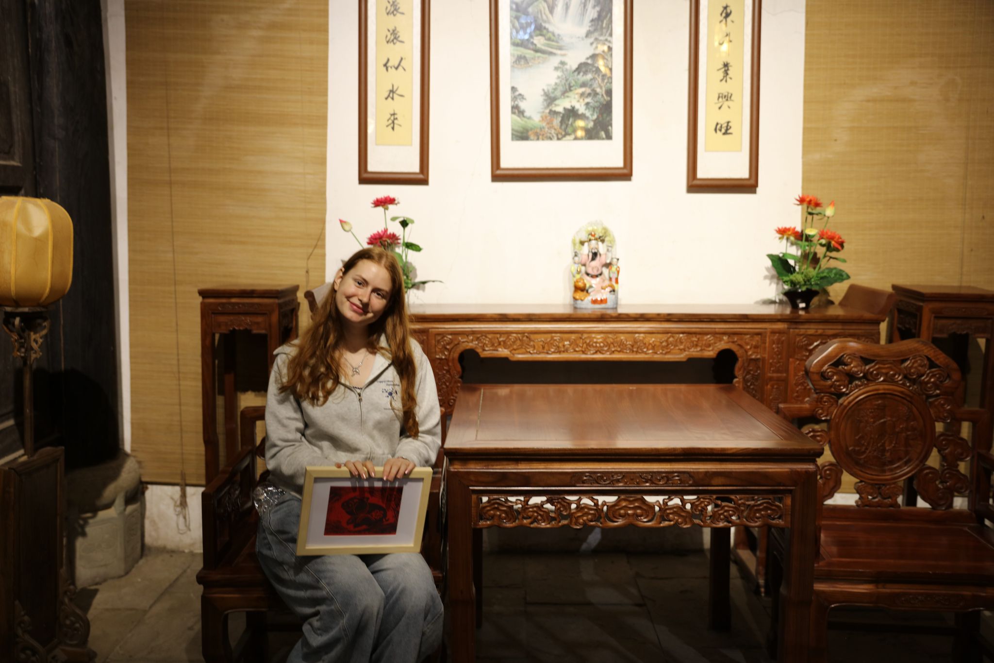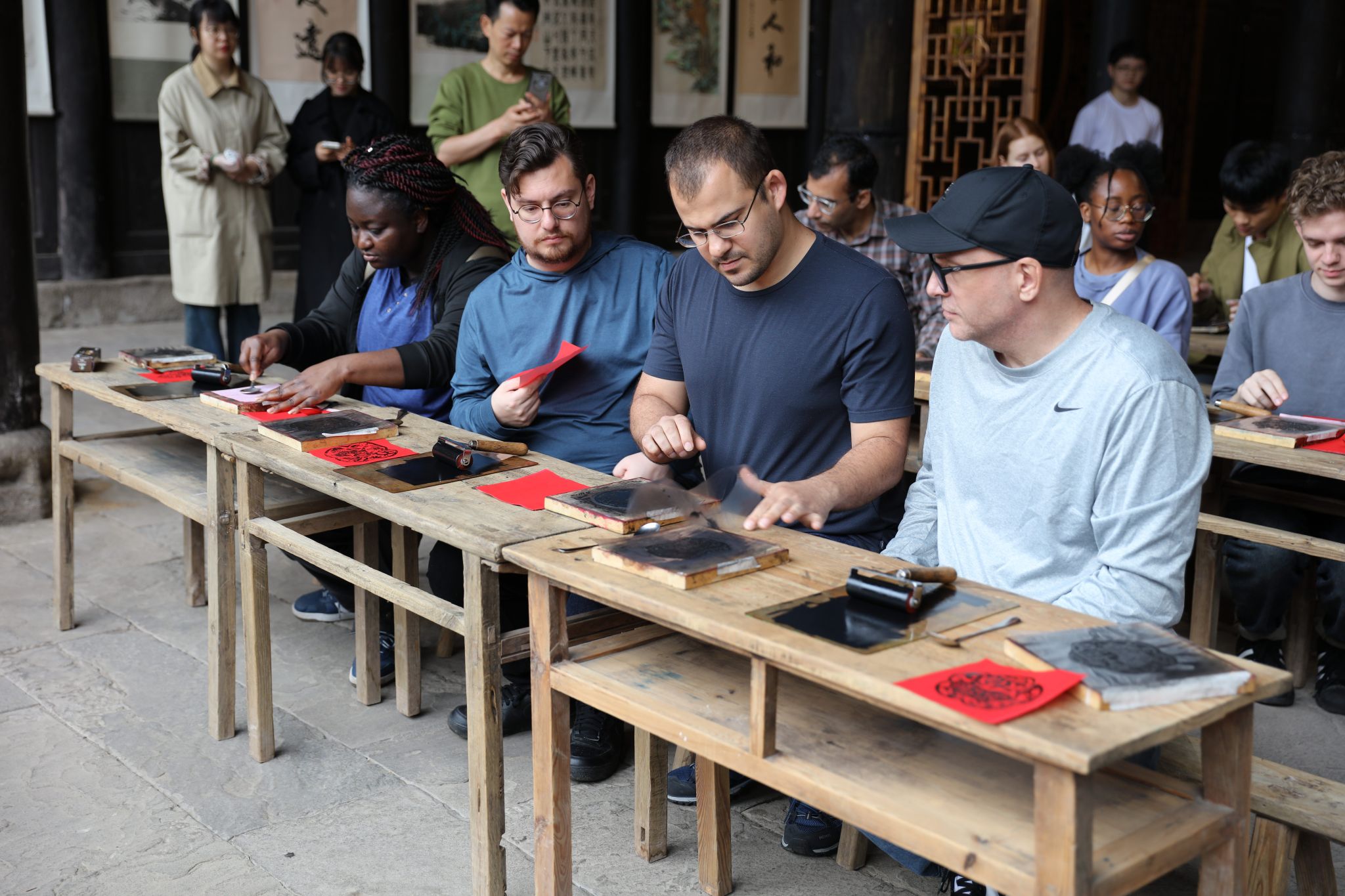 万天宫内,非遗文化体验掀起本次活动的高潮。东溪古镇作为农民版画的重要发源地,本次活动特别设置了“十二生肖版画”环节,中外师生在传承人指导下,选择心仪的生肖雕版沉浸创作。留学生Luisa捧着刚印好的“生肖猪”版画感叹:“猪在中国文化里象征富足,这圆滚滚的憨态太可爱了,让我想立刻寄给远在德国的家人。”