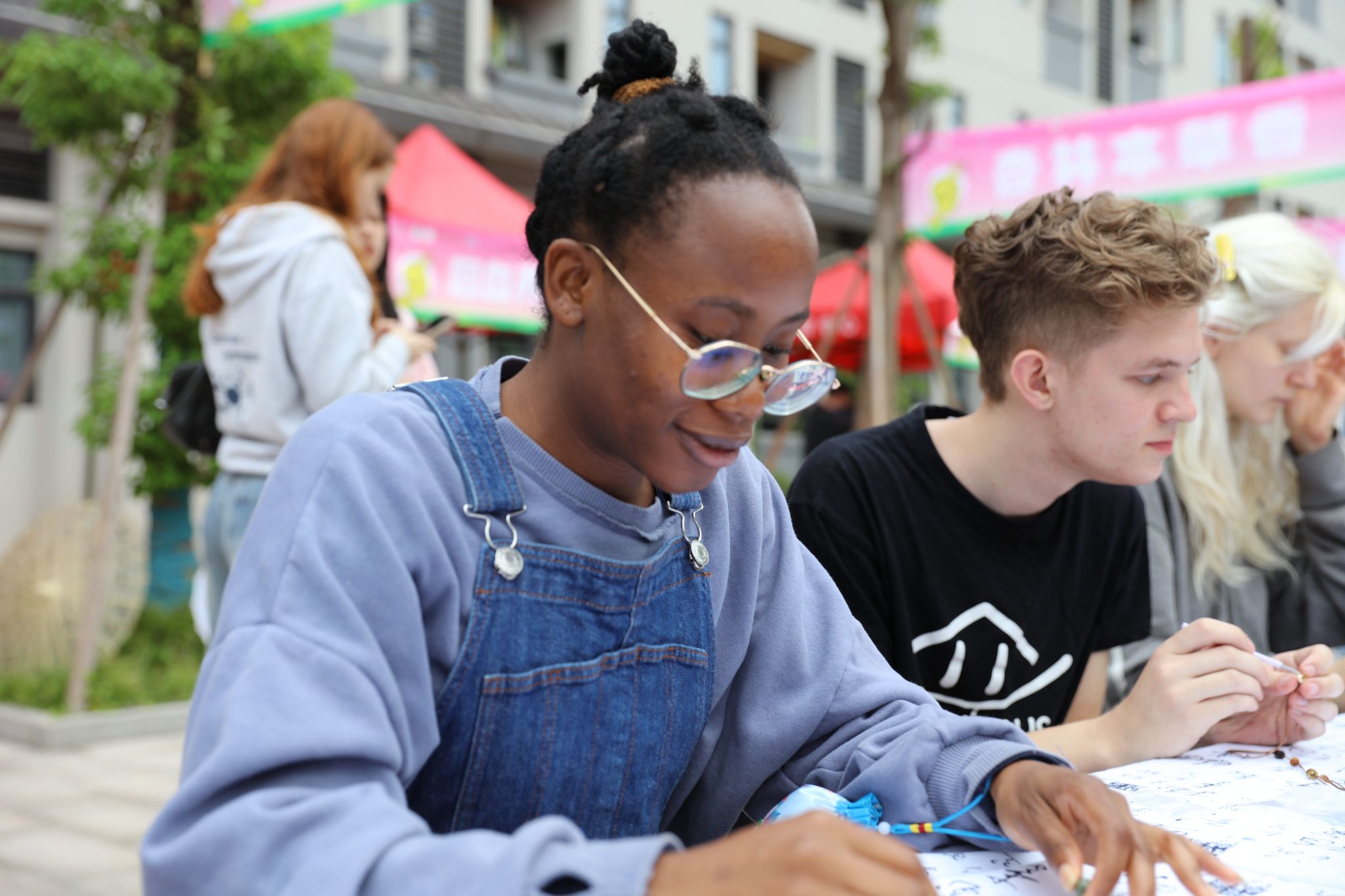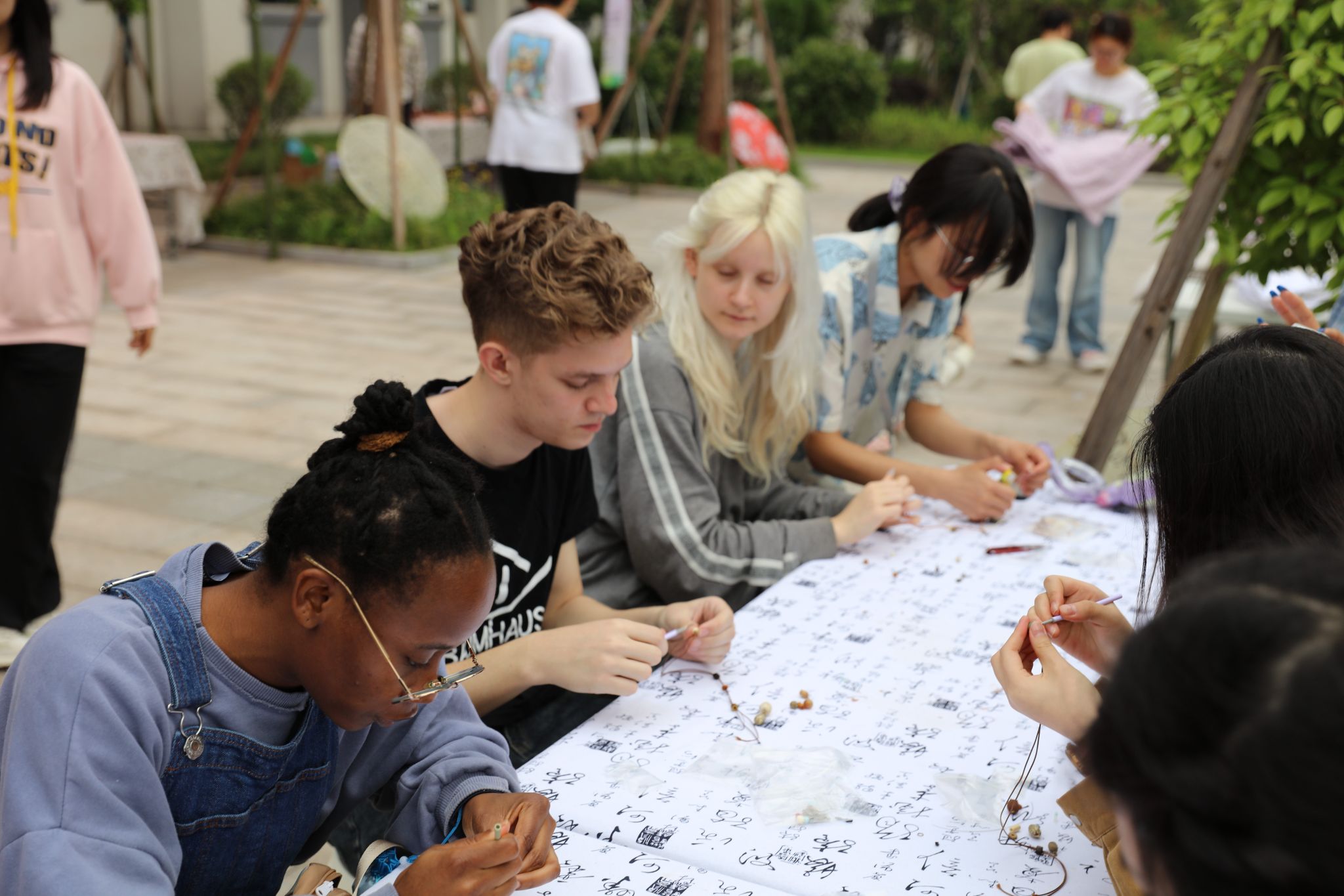 在中药材首饰DIY环节,外籍师生与我校学生协同合作,将砂仁、甘草、五味子等常见中药材用细线穿成一串形成美轮美奂的手链或干花耳环。药香混着欢声笑语,一枚枚饰品成为跨文化交流的独特信物。