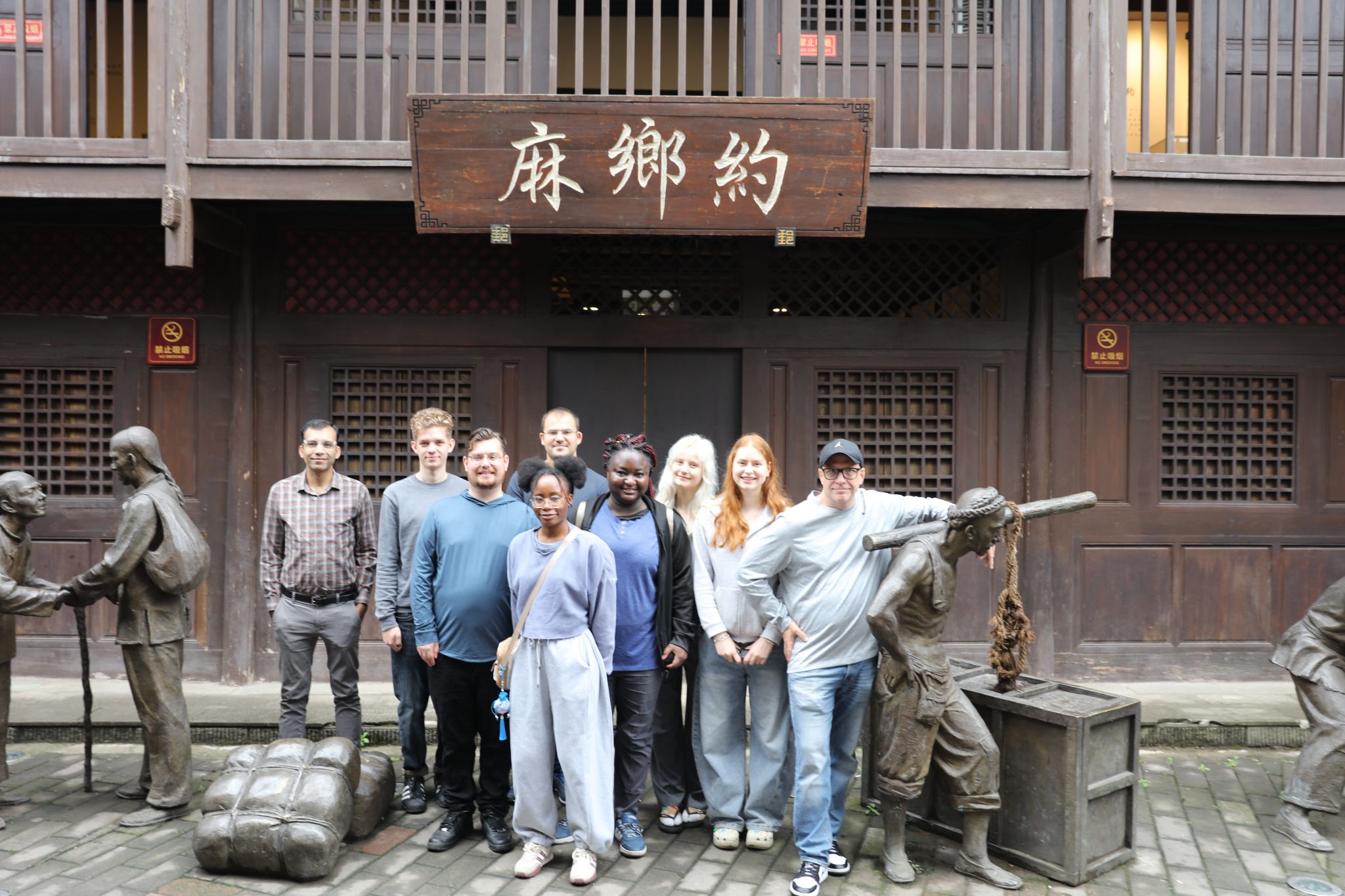 乘车抵达抗战一条街后,仿若踏入历史长河,师生们穿行于传统古建与近代洋楼之间,频频举起相机记录中西合璧的建筑美学。在西南地区最早民间邮局“麻乡约”遗址前,脚夫雕像似在诉说往昔奔忙,师生们围聚于此,笑语盈盈合影留念,让历史与当下定格成温暖画面。