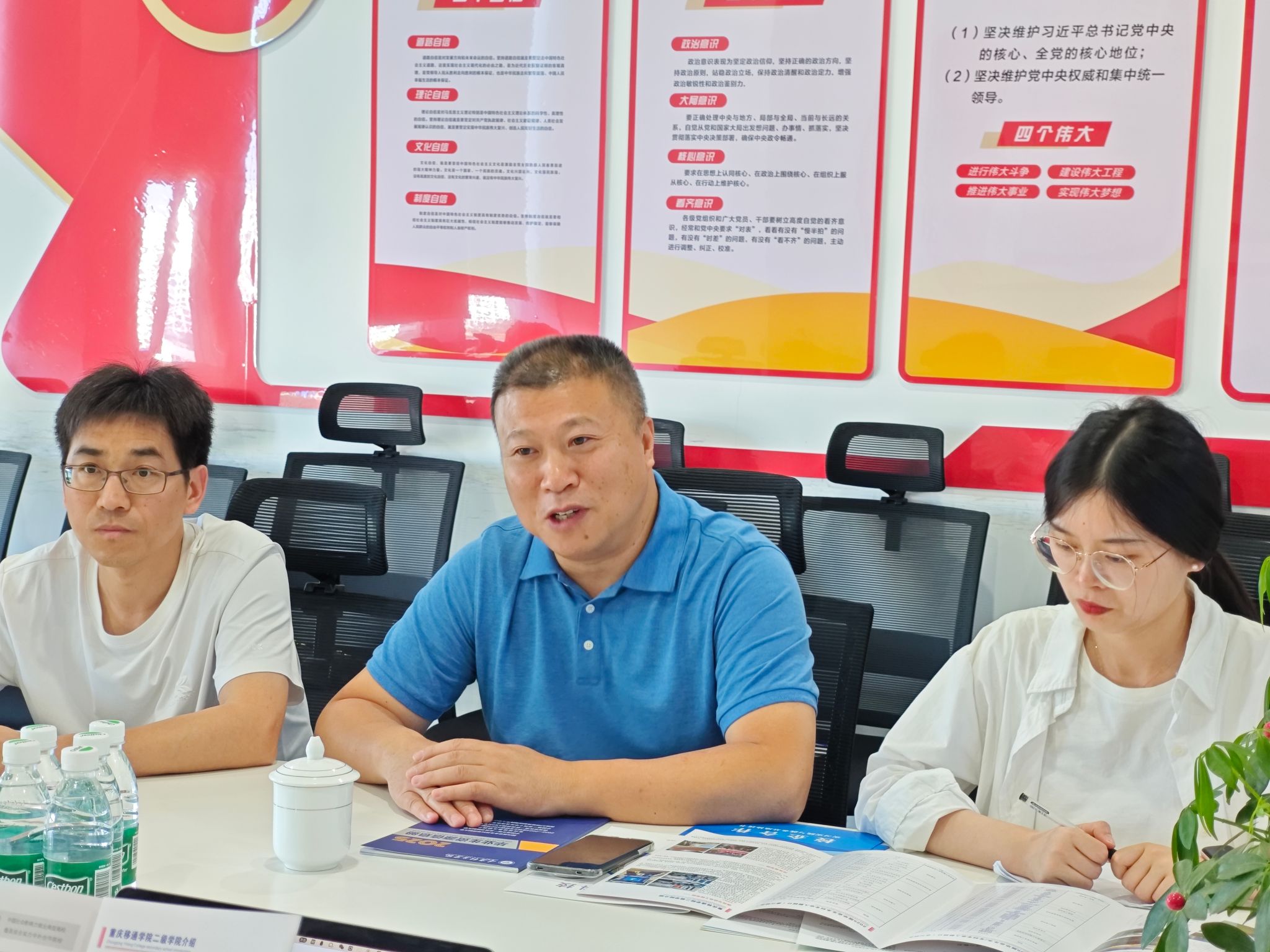 大数据学院院长潘显兵简要介绍了学校的发展历程以及大数据学院的专业基本概况,让公司对学校的整体实力和学科特色有了更清晰的认识。重庆移通学院依托其公共大数据安全技术重庆市重点实验室,展示了其“校企协同、项目驱动”的应用型人才培养模式,并分享了在数据科学、智能计算等领域取得的阶段性成果,彰显了学校在相关领域的深厚积累和创新实力。大数据学院就业创业办公室主任蔡娜就学院现阶段学生就业情况及就业岗位需求做了简要汇报,使公司能够更精准地对接学校的人才资源。