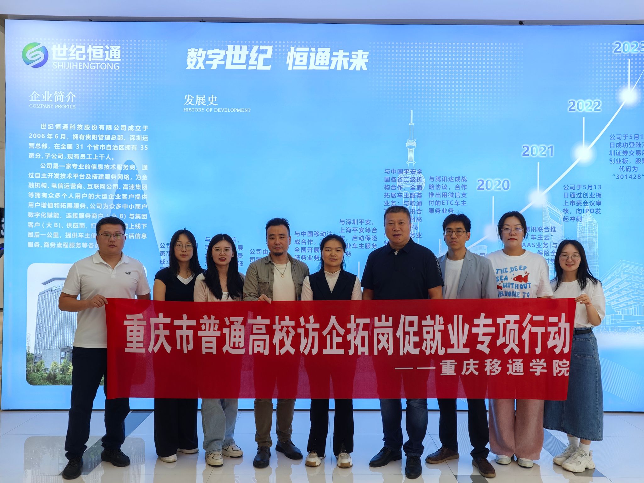 为进一步推动校企深度融合,精准对接产业需求,提升人才培养与市场需求的契合度,拓宽学生就业创业渠道,2025年5月8日、5月9日,重庆移通学院大数据学院院长潘显兵、就业创业办公室主任蔡娜、基础教研室主任张华、虚拟现实技术教研室主任闫攀、辅导员刘奕辰、甘艳平、陈美琪组成的走访团队,前往贵州白山云科技股份有限公司和世纪恒通科技股份有限公司进行访问交流。通过与企业面对面沟通,深入调研行业前沿动态与用人标准,旨在为学院优化专业设置、完善课程体系、创新实践教学模式,切实增强学生的就业竞争力与职业发展潜力,构建校企协同育人的良好生态。