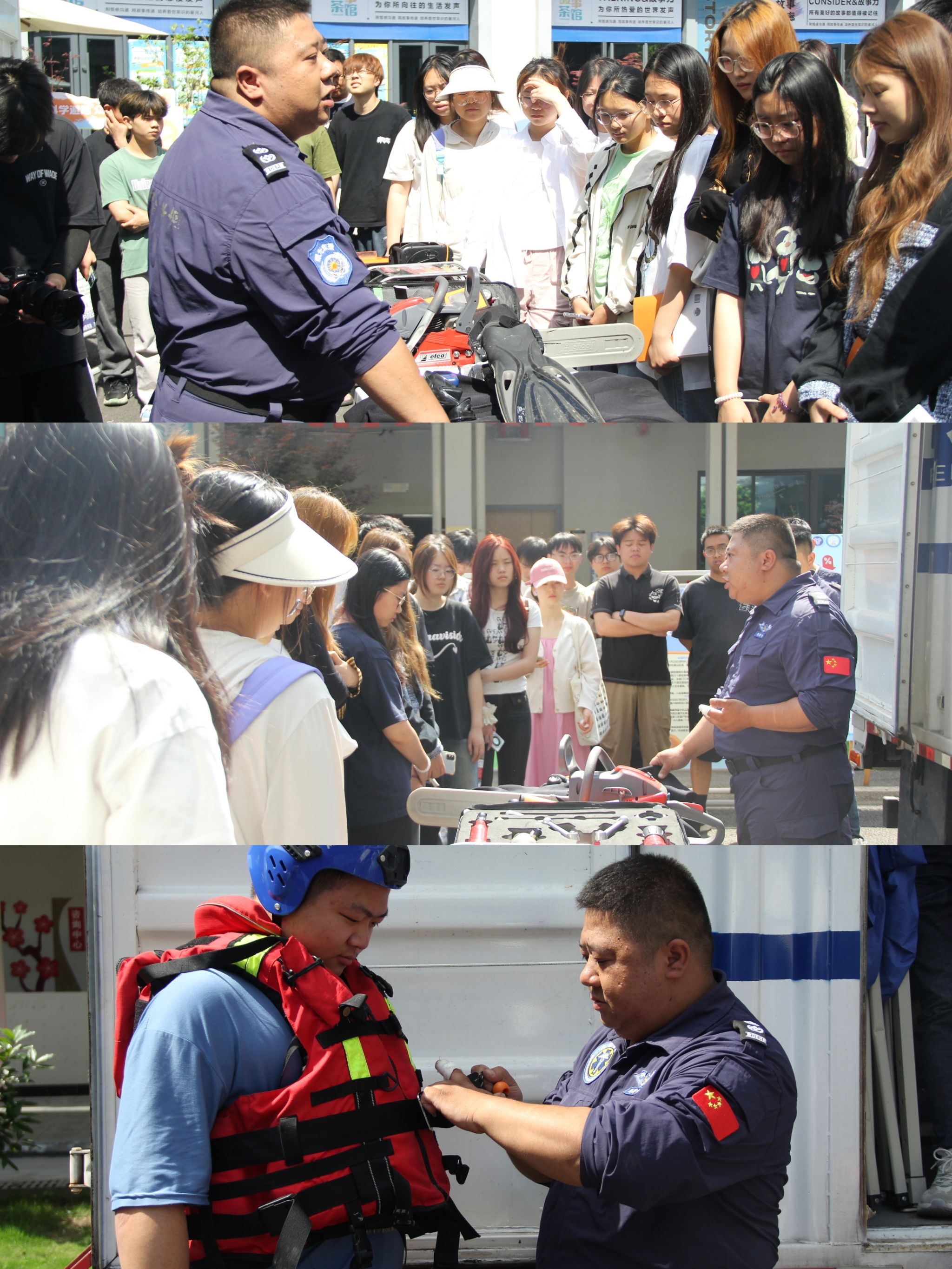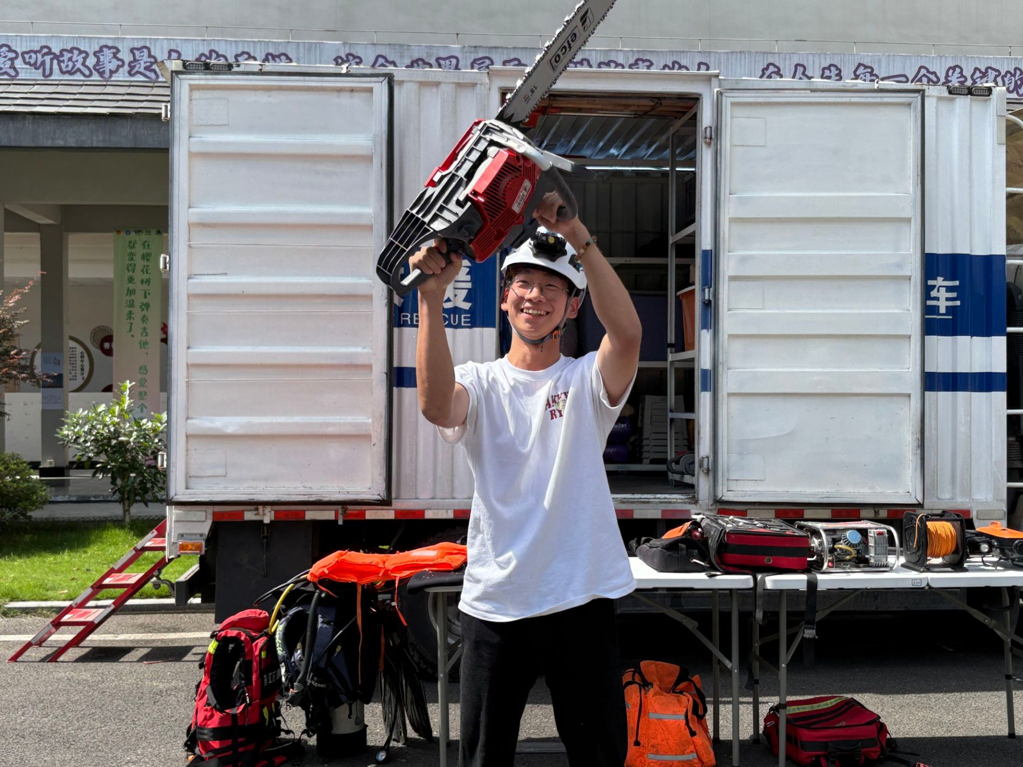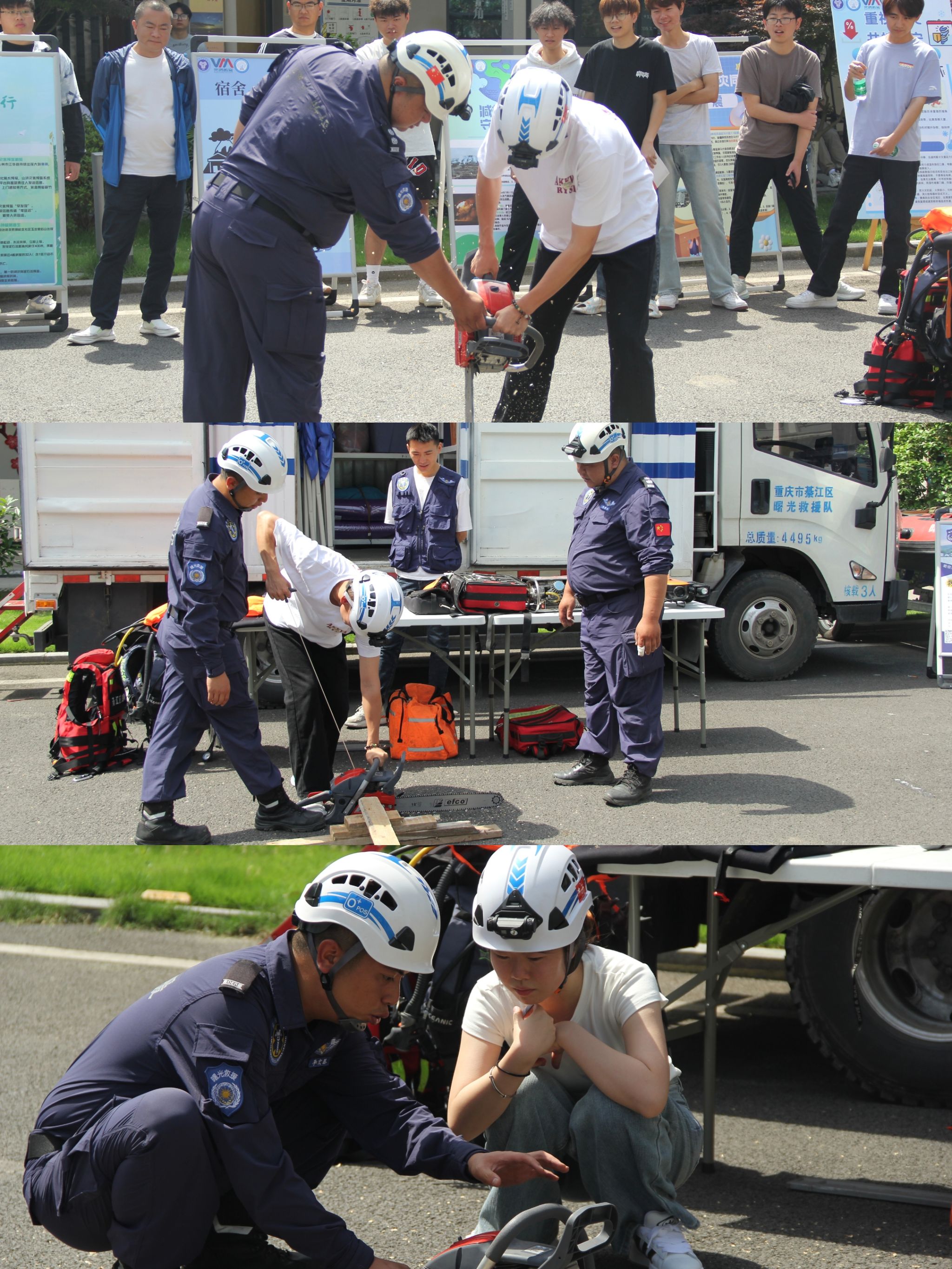 活动上午,“曙光救援队”率先亮相活动现场,通过实物展示与实操演练,向同学们普及救援器械的使用方法及逃生技巧。救援队员详细讲解了液压破拆工具、生命探测仪等专业设备的应用场景,并邀请学生亲身体验电锯切割木材等模拟救援环节。现场气氛热烈,不少同学表示:“第一次接触这些设备,既紧张又兴奋,但更深刻体会到救援工作的不易和科学避险的重要性。”