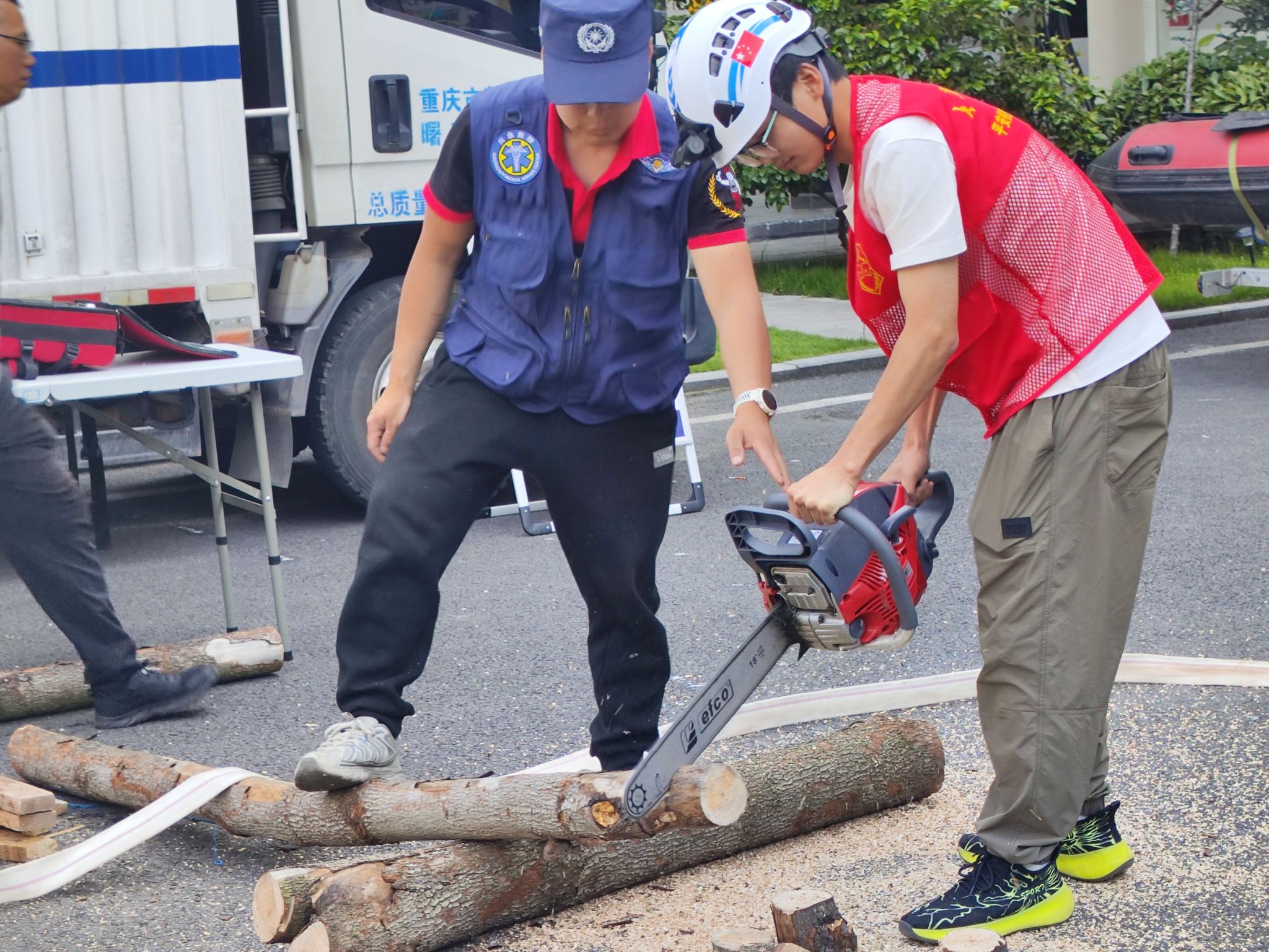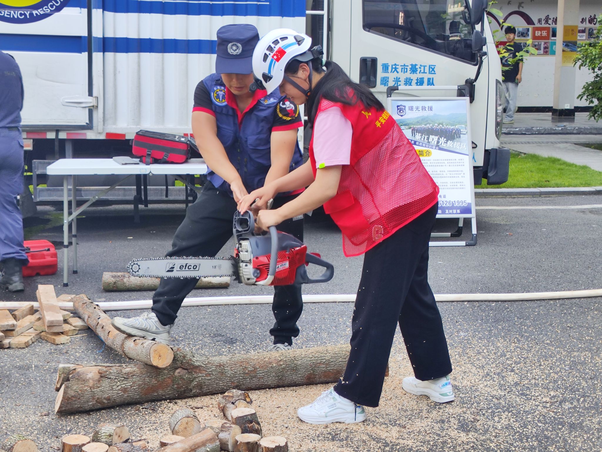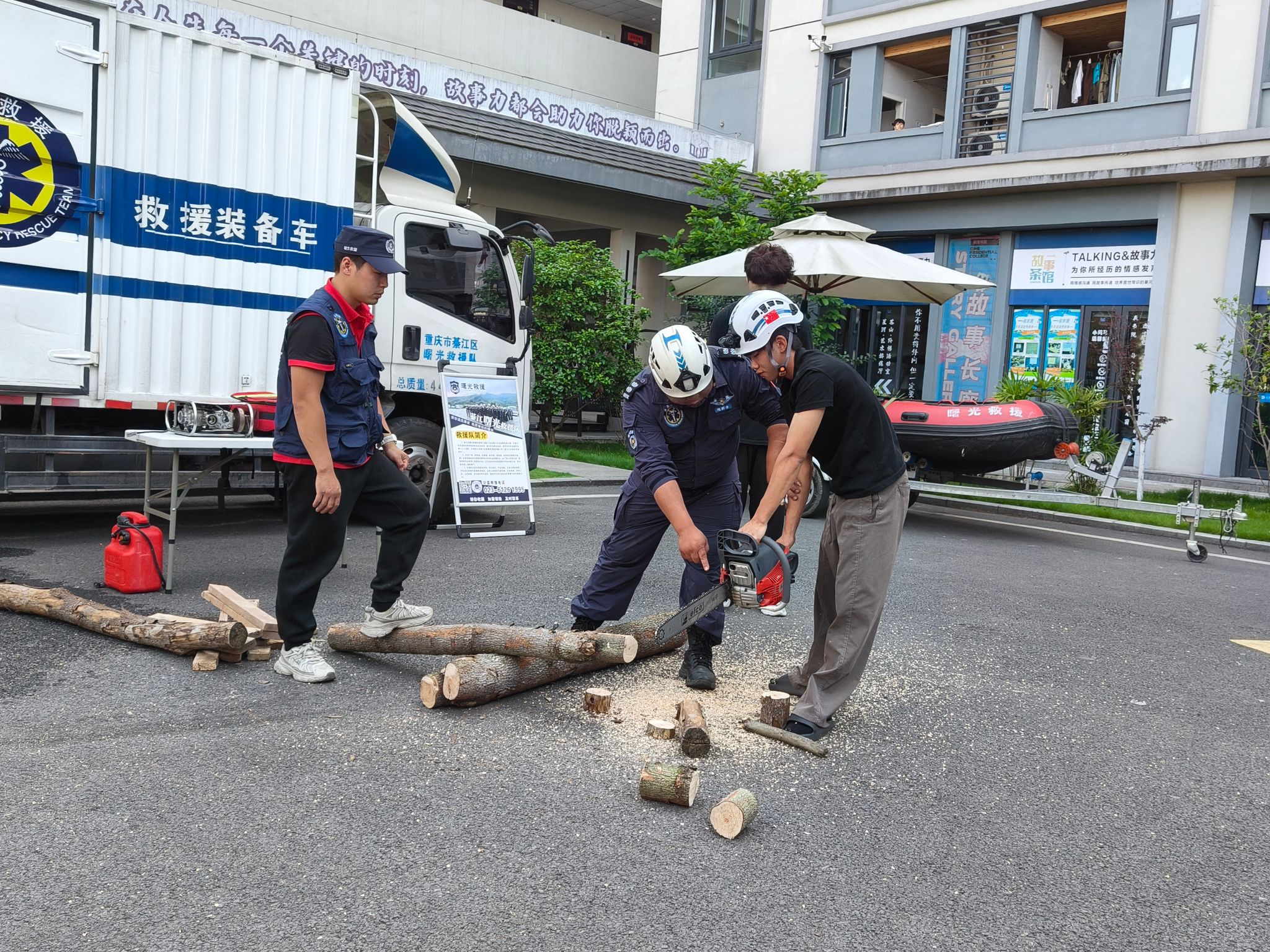 活动上午,“曙光救援队”率先亮相活动现场,通过实物展示与实操演练,向同学们普及救援器械的使用方法及逃生技巧。救援队员详细讲解了液压破拆工具、生命探测仪等专业设备的应用场景,并邀请学生亲身体验电锯切割木材等模拟救援环节。现场气氛热烈,不少同学表示:“第一次接触这些设备,既紧张又兴奋,但更深刻体会到救援工作的不易和科学避险的重要性。”