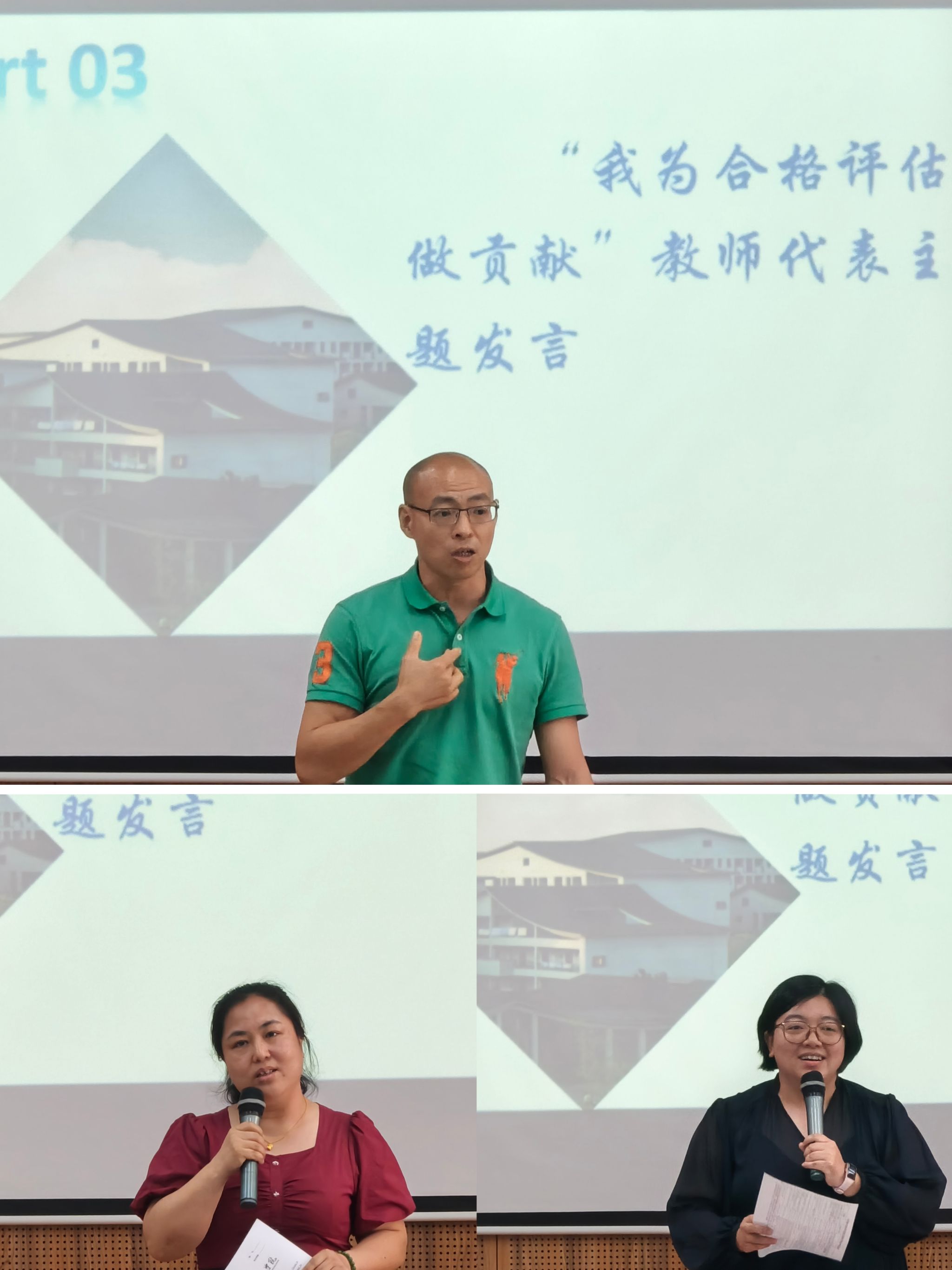 在“我为迎评工作做贡献”主题发言环节,教师代表结合工作实际分享经验。英语专业教研室刘艺书表示“教案内容紧扣培养目标,学生成长全周期追踪知识-能力-素养发展轨迹,课堂教学融入AI+OBE双核驱动改革,助力教育教学内涵提级”;公共外语教研室高金才强调“立规矩强管理、抓细节提效能”;德语专业朱惠东以督导、专业负责人视角剖析教学资料规范化路径;专门用途英语教研室邱际阳探讨“AI技术在师生互动中的应用路径,构建智能化教学场景,推动教学模式创新”;学工办主任纪治阳则从“辅导员说育人”实践出发,总结协同育人成效。发言聚焦教育教学痛点,彰显教师队伍的责任担当与协同创新的改革共识。