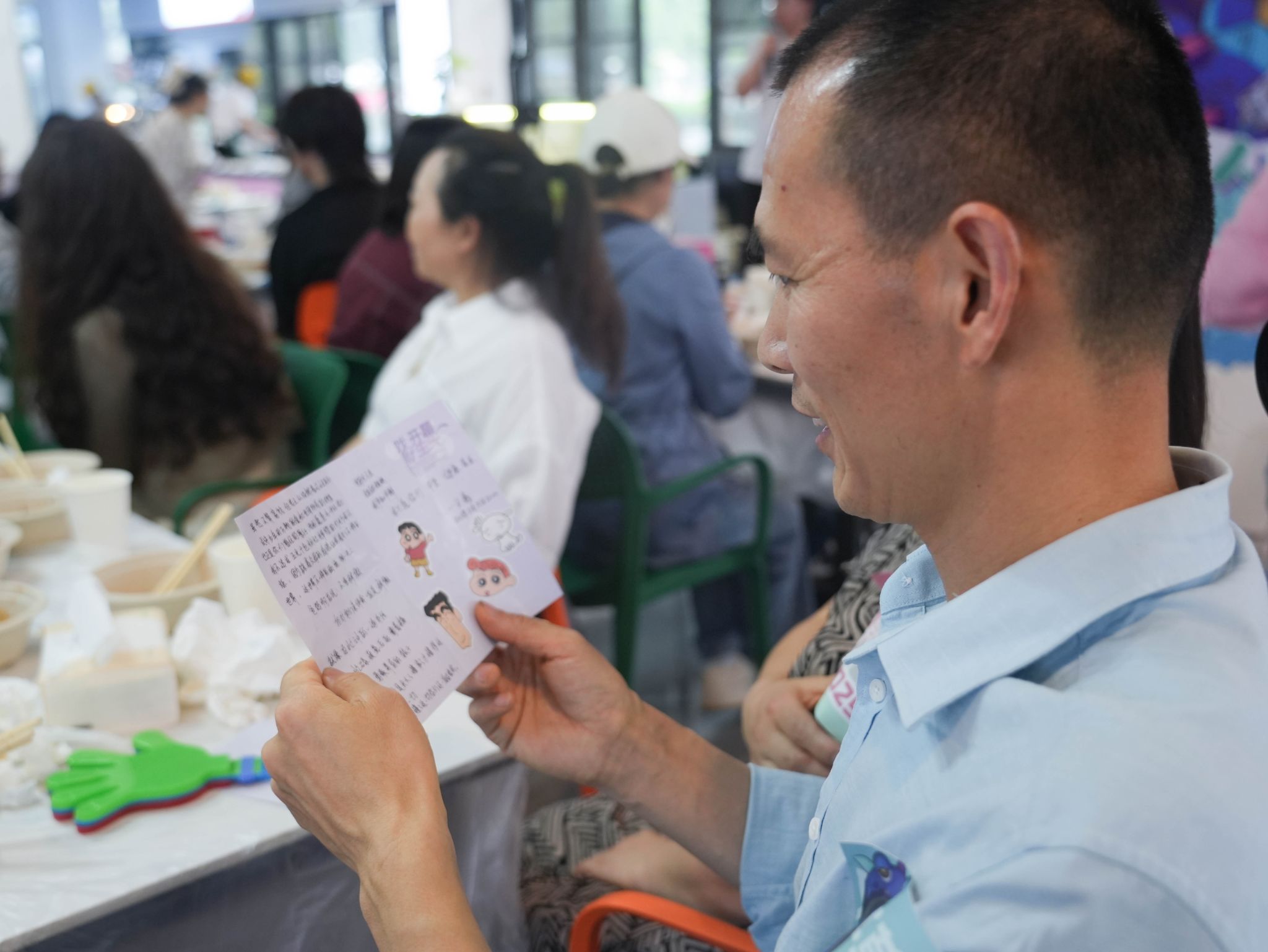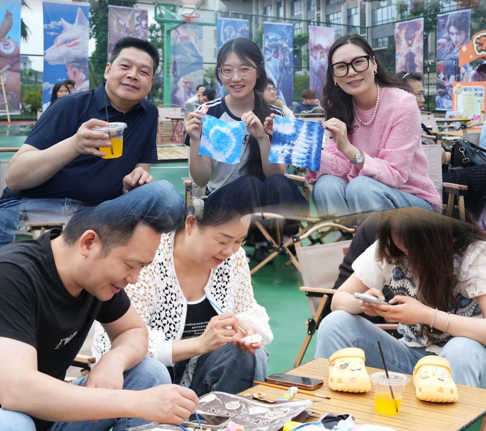 家长和孩子共同参与体验,或一起捏泥塑,经验丰富的戏娃成了“老师”带领家长做手工,成品精致又好看;或一起为玩偶上色,一家人专注地为玩偶描绘上色,不时交换会心的微笑;或一起体验扎染,亲子合力捆扎布料,蓝色的染料在棉布上晕染出独一无二的图案,温馨和活力充满了完满活动现场。一位戏娃母亲开心地表示见证了孩子在大学人生中最青春最美的时刻“没想到孩子在学校除了学习,还能参加这么多好玩的活动,移通来得太值了!”