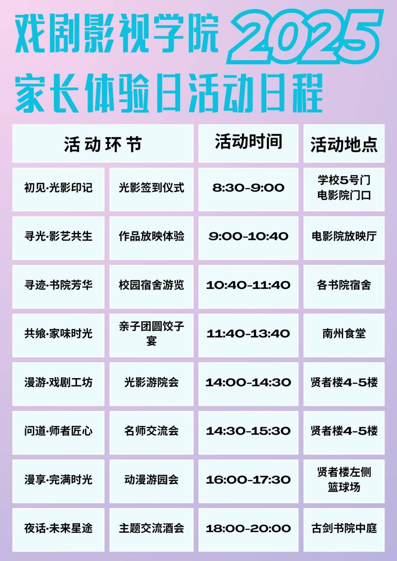光影五月,多彩校园。2025年5月16日,戏剧影视学院倾情打造“以光影知名·共绘成长之约”——2025年家长体验日主题活动,活动邀请30余个家庭走进校园、体验课堂,感受学校和学院的特色教育,走进孩子在校学习、生活、活动场域,走近孩子的内心世界,关切孩子的想法和需求,深入了解孩子们的大学生活状态,从清晨的“光影签到”到傍晚的“星光夜话”,八个精心设计的环节串联起家校共育的温暖篇章。