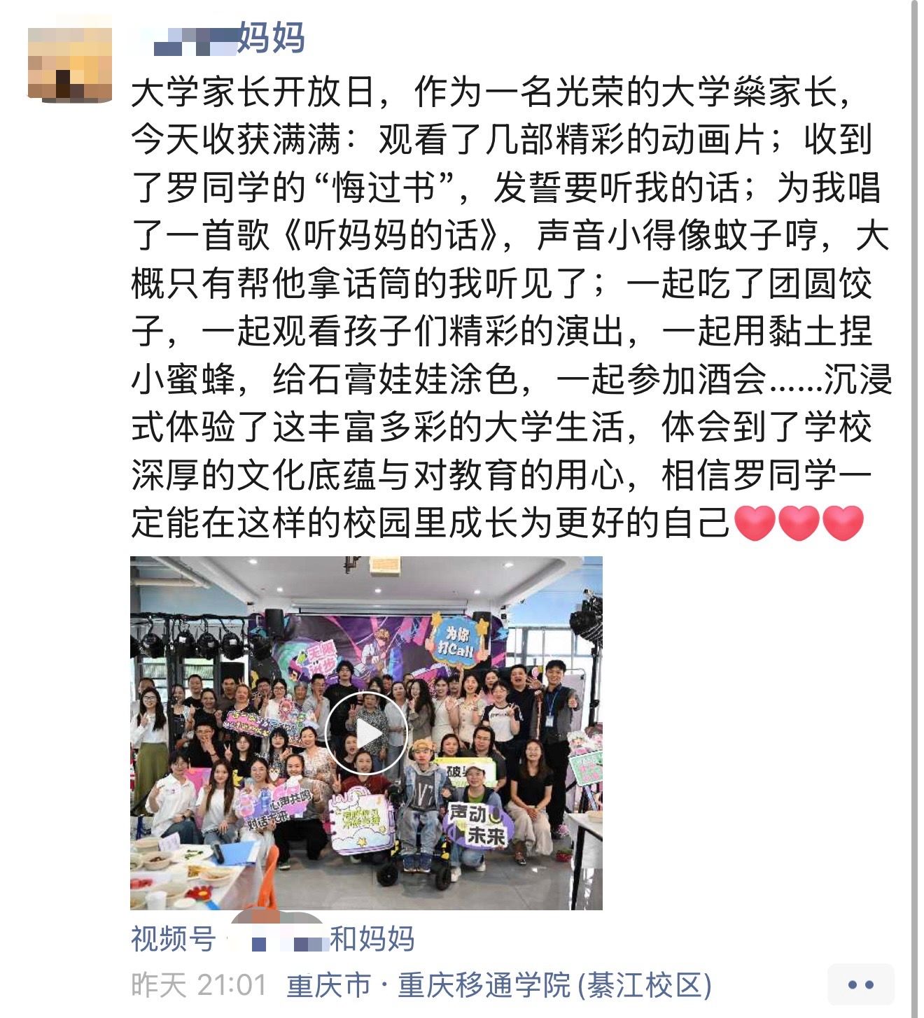 大学家长开放日,作为一名光荣的大学“燊”家长,今天收获满满:观看了几部精彩的动画片;收到了罗同学的“悔过书”,发誓要听我的话;为我唱了一首歌《听妈妈的话》,虽然声音小,但对于以前不爱上台的他来说是一次进步;一起吃了团圆饺子,一起观看孩子们精彩的演出,一起用黏土捏小蜜蜂,给石膏娃娃涂色,一起参加酒会……沉浸式体验了这丰富多彩的大学生活,体会到了学校深厚的文化底蕴与对教育的用心,相信罗同学一定能在这样的校园里成长为更好的自己。