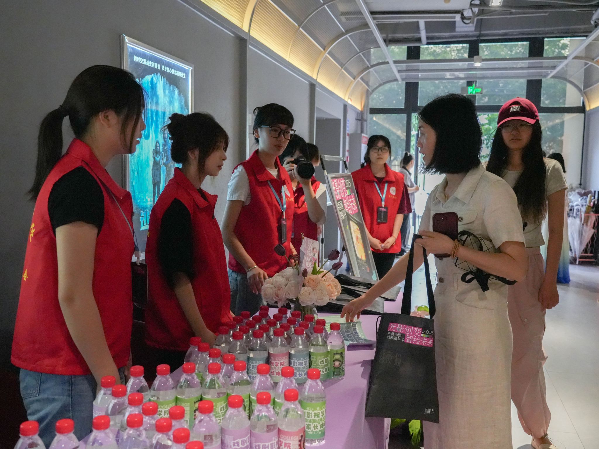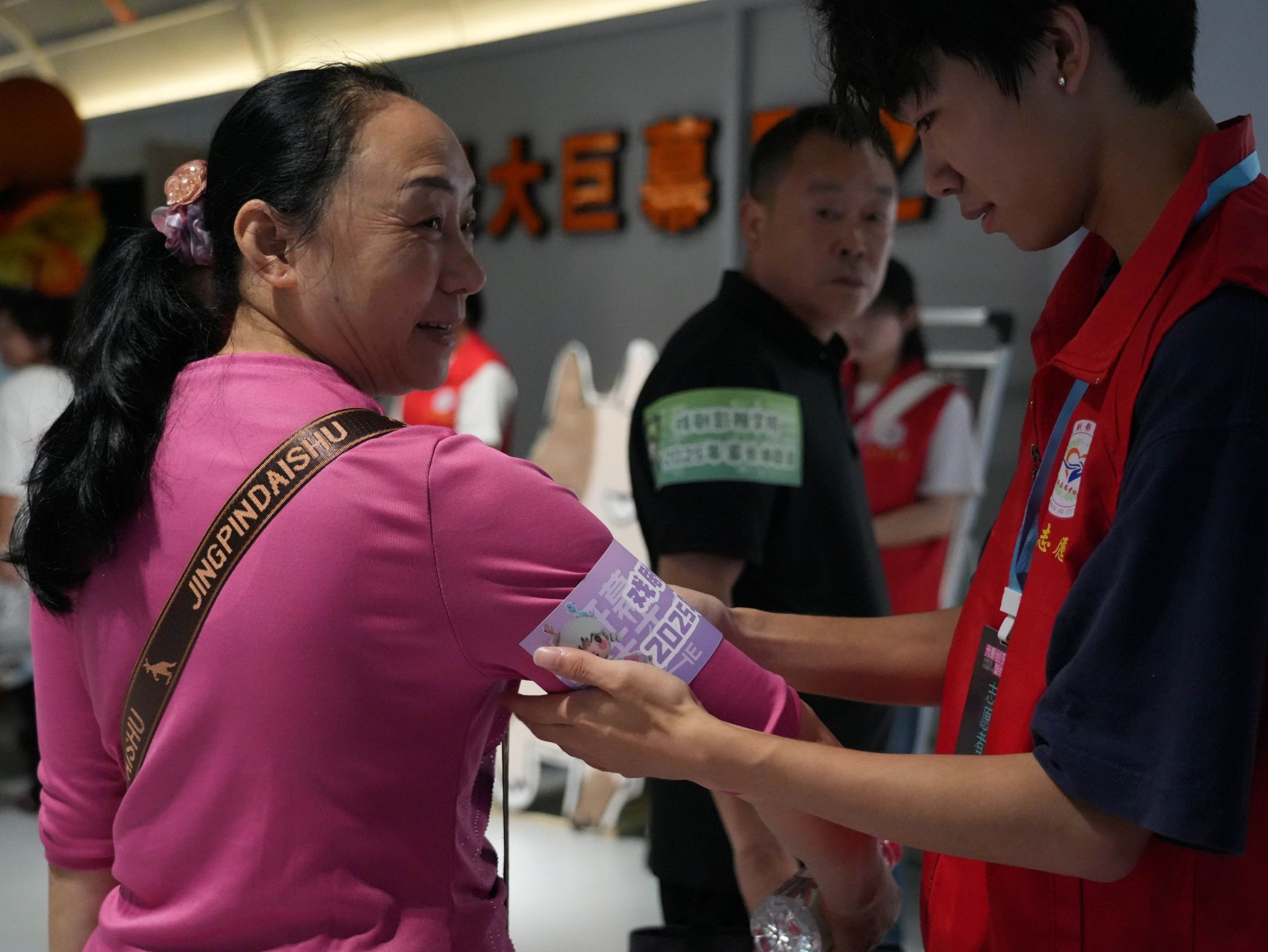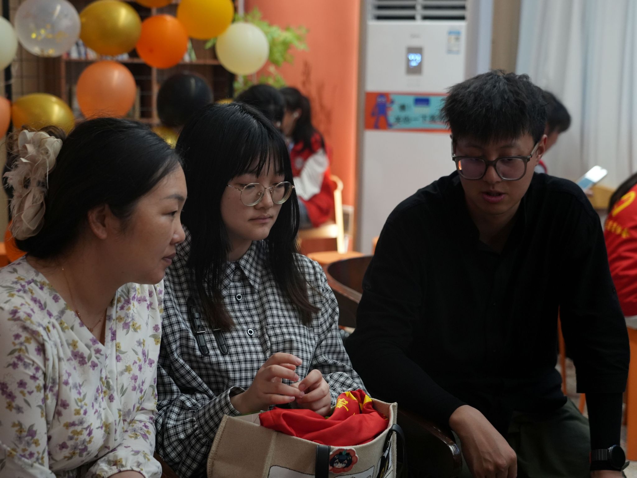 伴着清晨的微雨,家长们如约而至。在学生志愿者的引导下,30个家庭在学校电影院门口参与“光影签到”仪式。快门声此起彼伏,镜头里戏娃一边给父母贴上学院定制臂贴,一边诉说着今天的活动日程,稀松平常却珍贵难忘。一本打卡册、一张亲子照,这一刻的移通,成了亲情最温暖的取景。