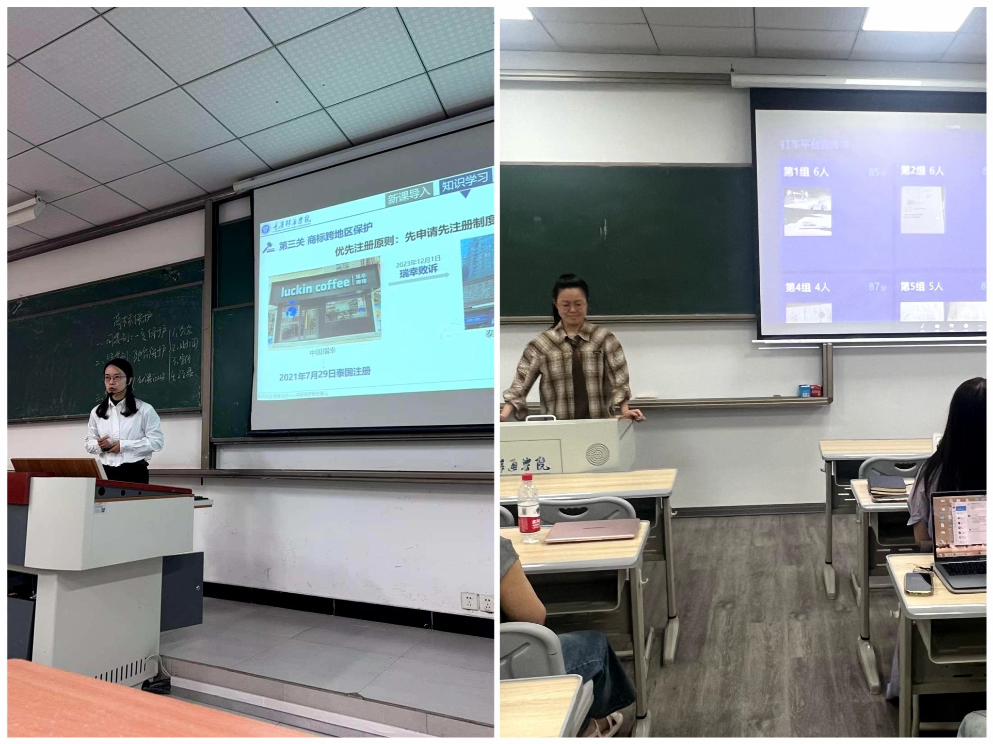 首先,部分老师尝试用多元模式破解教学壁垒。比如冯丽丽老师在《数字营销与消费心理》课程中设计“双视角任务链”,要求学生在10分钟内以商家视角完成打车平台宣传单设计并实时上传学习通平台,随后切换用户视角互评,最终提炼品牌个性塑造三步骤。通过“高压创作+即时反馈”闭环,破解艺术生理论认知难题,实现实践与理论深度融合。胡小娟老师在《商标保护》课程中,以《孙子兵法》战略为引,结合B站侵权、瑞幸海外维权等案例,设置“同类别保护”“跨类别保护”“跨地区保护”三大闯关任务。学生通过中国商标网实操、小组探讨《哪吒2》海外商标策略,沉浸式理解法律逻辑,强化知识产权保护意识。