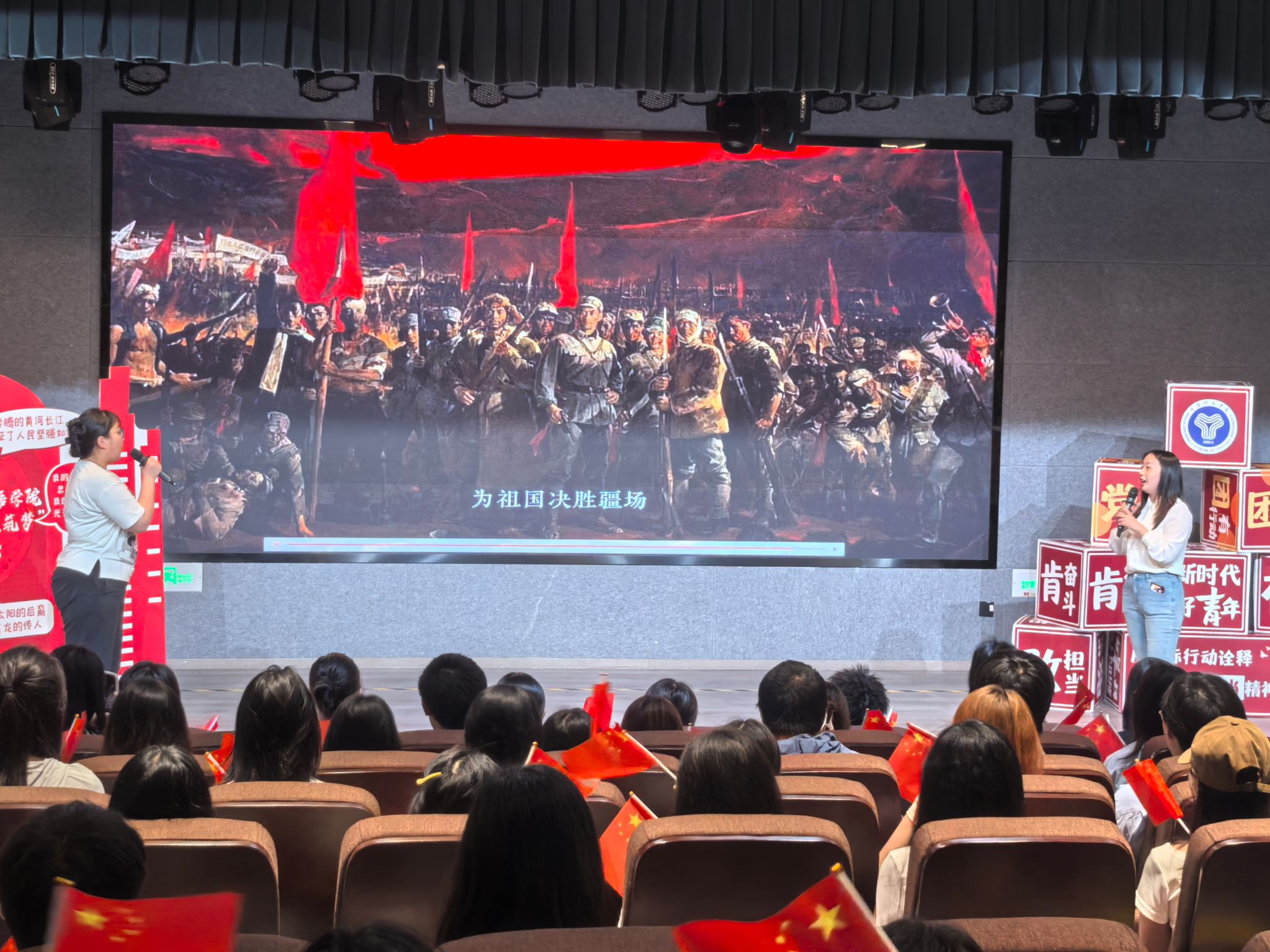 最后的青春歌唱环节,全体同学在异科导师带领下,面向国旗齐声高唱《强军战歌》。激昂的旋律中,爱国情怀在每个人心中激荡,现场气氛达到高潮。随后,师生们在红色主题合影墙前,手持国旗与横幅,齐声喊出“传承红色基因,争做时代新人”的铿锵誓言,用镜头定格这一意义非凡的时刻。