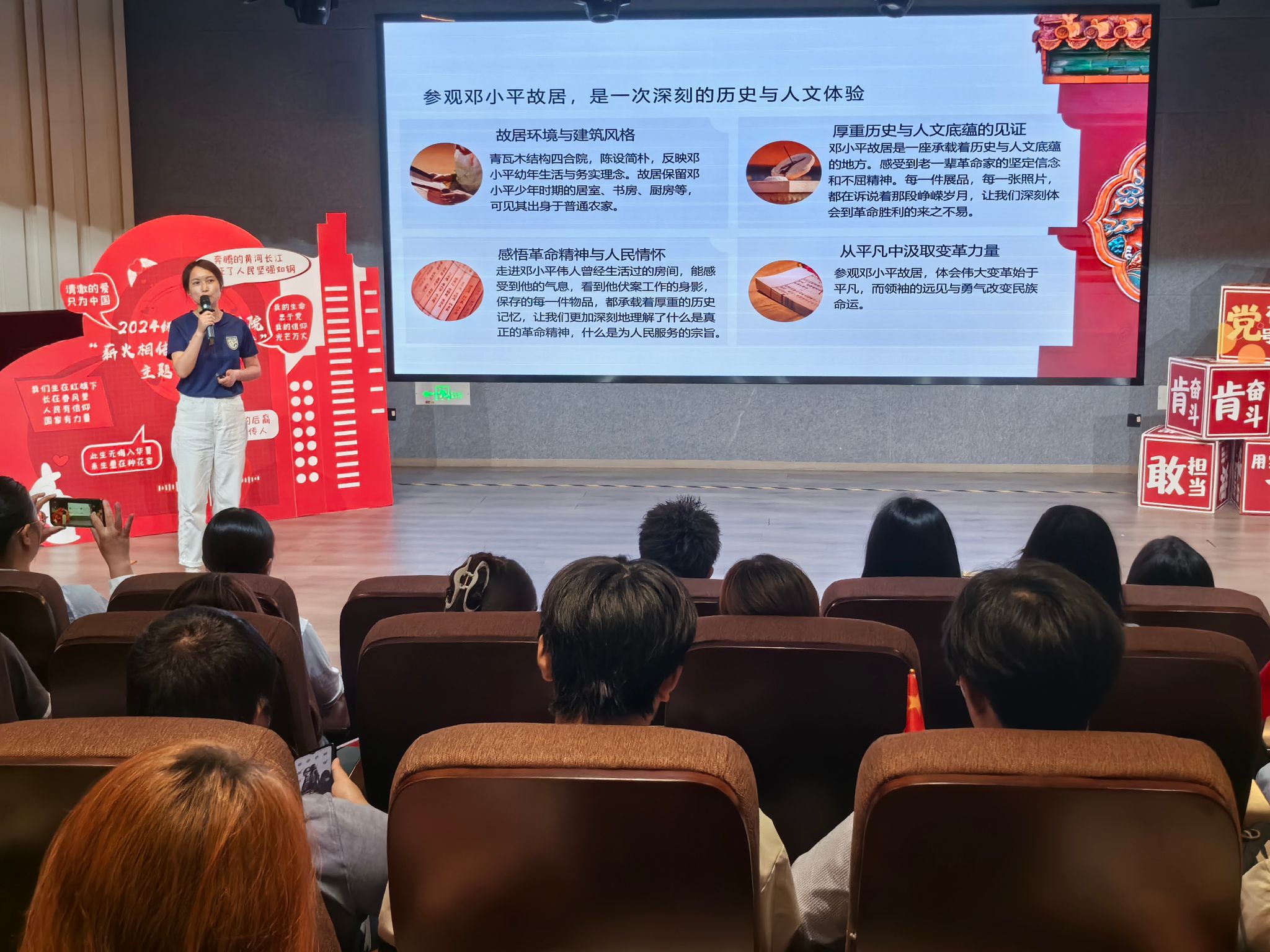 随后,来自图书馆的吕淑艳老师讲述了前往邓小平故居的见闻。踏入故居,青瓦白墙、古朴庭院,每一处陈设、每一件旧物,都诉说着邓小平同志波澜壮阔的一生,从年少赴法勤工俭学寻求救国真理,到领导改革开放让中国经济腾飞,他始终把人民放在心间,为国家发展、民族复兴不懈奋斗。吕老师分享道,伟人虽已远去,但他的精神如明灯照亮我们前行之路。她鼓励同学们,传承红色基因,不能只停留在口头上,更要付诸行动,胸怀家国,志存高远,在学习中积累知识、锤炼本领,将来成为国家建设的栋梁之材,在时代浪潮中担当起青年一代的使命。