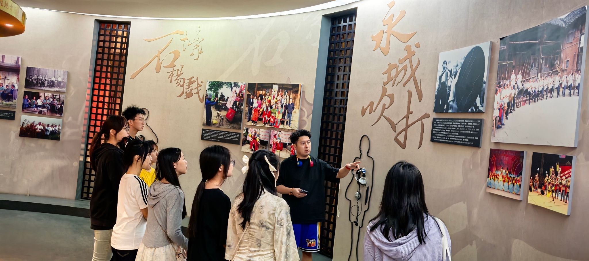 随后,谭松林老师则结合《古典音乐入门》,带领同学们展开一场别开生面的“文物音乐鉴赏”之旅。他引导同学们思考:“如果这些文物会说话,它们会吟唱怎样的旋律?”通过对比不同历史时期文物的艺术特征,谭老师为同学们讲解了相应时代的音乐风格特点,并让同学们思考与文物年代相契合的古典乐曲片段。并在“永城吹打”主题展板中:让同学们在这次实践中深入地了解古典音乐严谨和声体系,永城吹打以唢呐为主要乐器,通过自由奔放的即兴演奏,生动演绎着婚丧嫁娶的民间百态。学生们注意到展柜中陈列的笙管笛箫与课堂上讲到的西方管弦乐器在形态和结构上有一定差异,谭老师顺势引导:“如果说西方音乐和乐器是精心雕琢的建筑,那么像永城吹打这样的中国民间音乐和器乐则更像是随性生长的民俗画卷。”