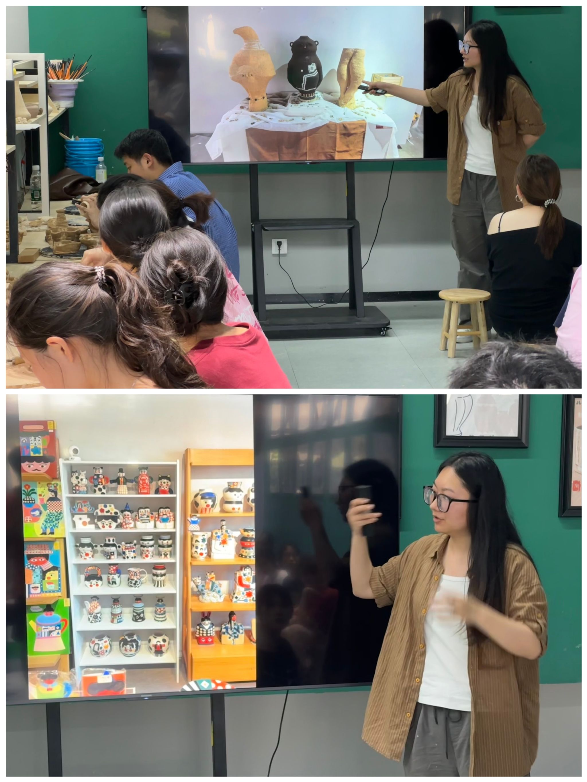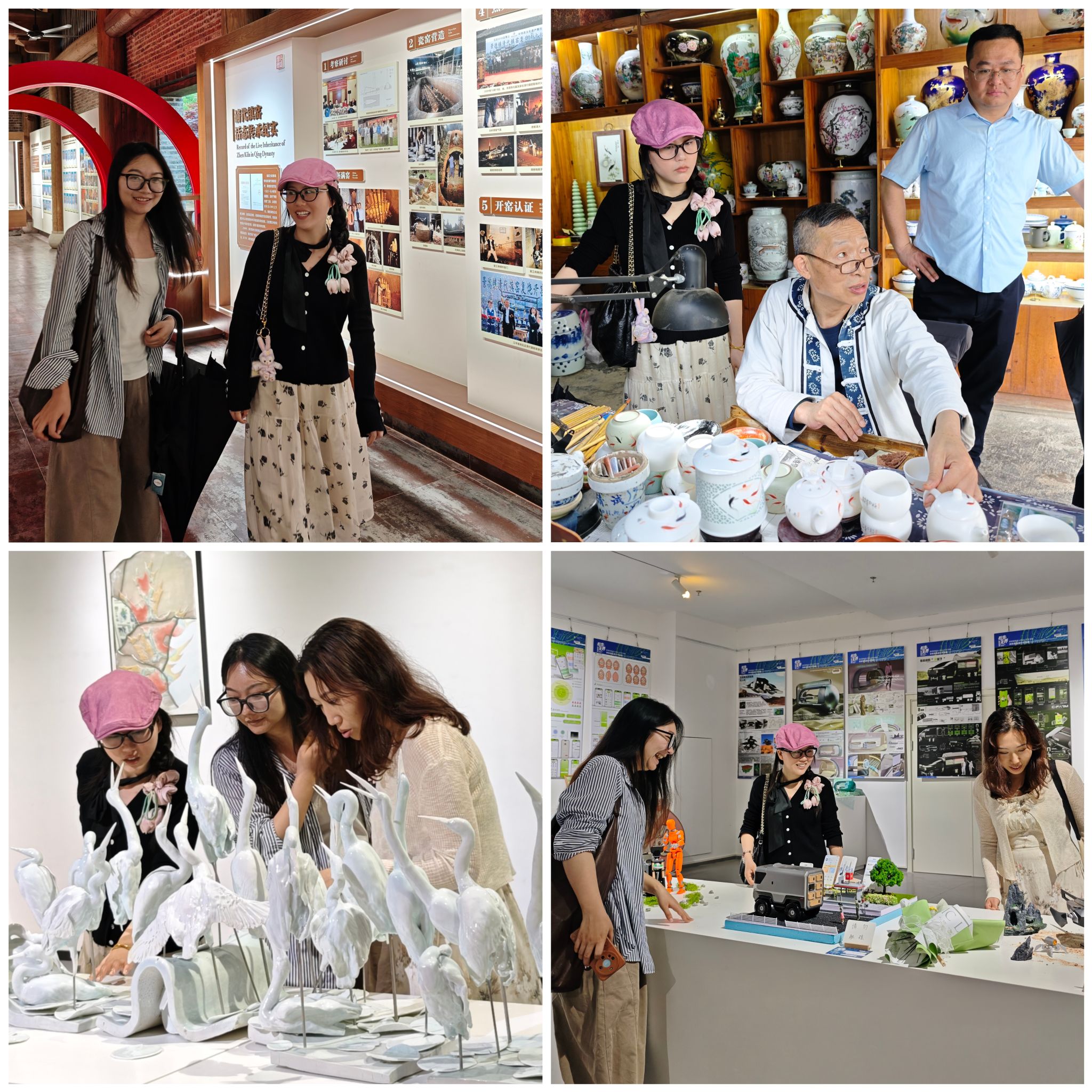 为全面提升陶艺教学的系统性与专业性,横山国瓷研学工坊教师团队以“观摩-体验-实践”的立体化学习模式前往景德镇开展了为期4天的深度研学。先后在景德镇陶瓷大学研习设计学院学子毕业作品的创新设计理念、深入艺术集市调研陶瓷艺术的市场动态,并亲身体验古窑72道传统工序的完整制作流程。“我想把这些都带回来与你们分享”,张姣老师边说边展示她在景德镇拍摄的珍贵照片和工艺视频。通过这些“一手资料”,同学们仿佛身临其境地感受到景德镇陶瓷艺术的千年文脉与创新活力。这种“名师亲历+现场还原”的教学模式,不仅突破了传统课堂的空间限制,更通过真实案例的立体呈现,帮助学生建立了系统的陶瓷知识体系,实现了国瓷研学从理论到实践的无缝衔接。