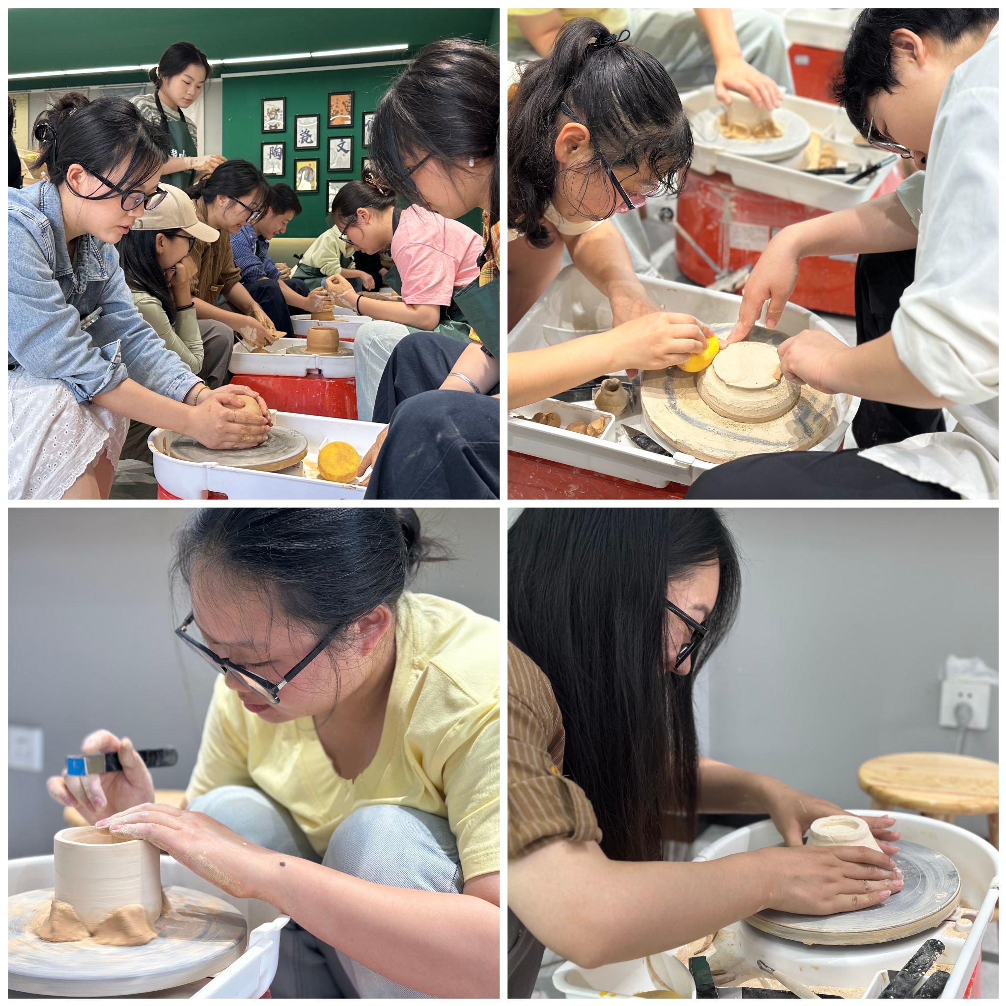 修胚,是一场与泥土的温柔对话。20余名书院学子在张姣老师的指导下执刀如执笔,以腕为轴,在旋转的胚体上勾勒时光—轻触、慢捻、细琢、精磨,每一个动作都精准到位,原本粗糙的泥胚渐渐显露出细腻的造型。通过手把手的示范教学,同学们逐渐掌握了修胚的核心技法,同时也深刻领悟到了“器以载道”的深层内涵。每一刀的力度与角度,都是同学们对材料的理解与尊重;每一次的打磨与修正,都体现着对完美的执着追求。这种沉浸式的修坯练习,让年轻学子们真切体会到传统工艺所蕴含的匠心精神与审美追求。