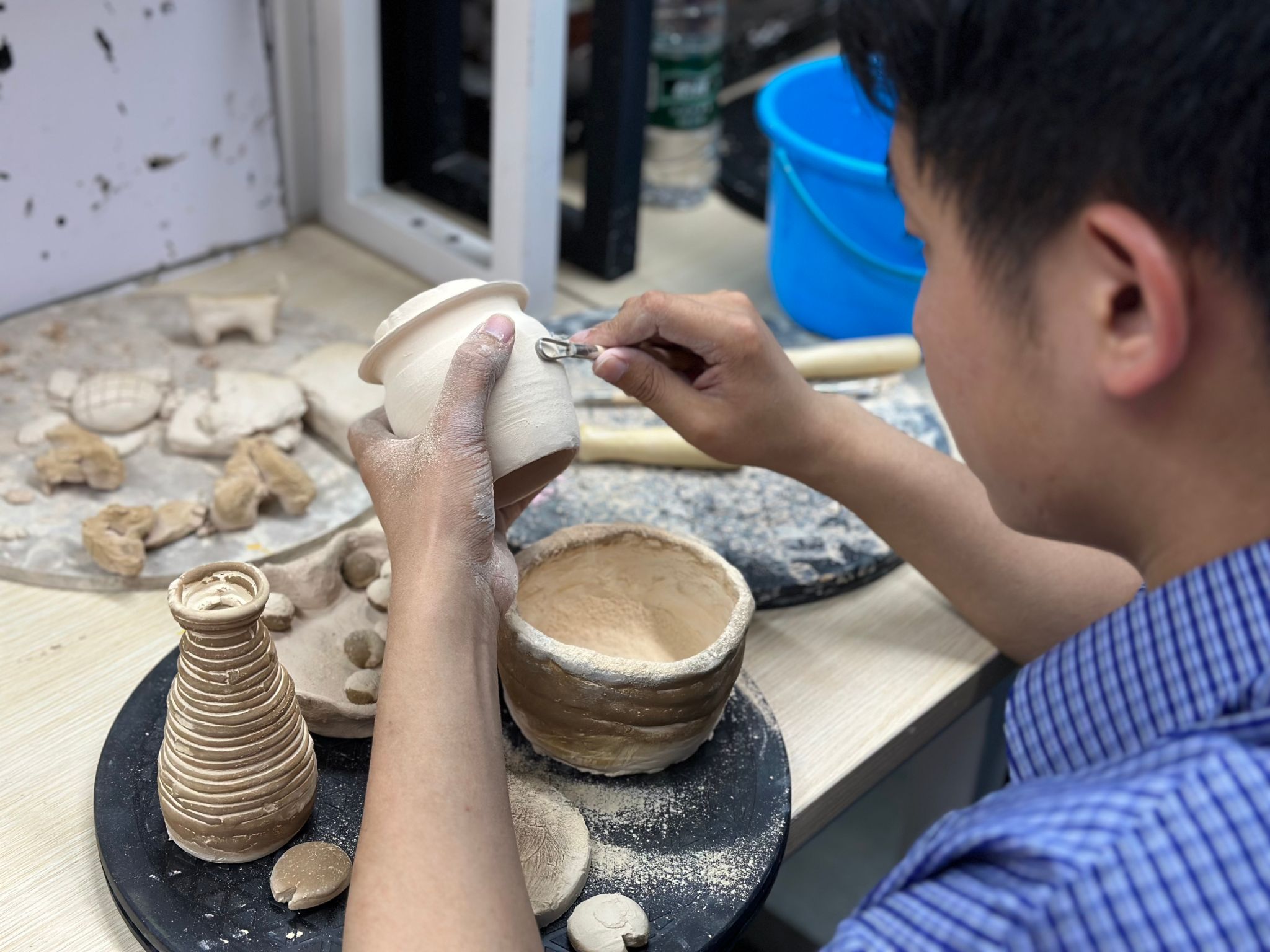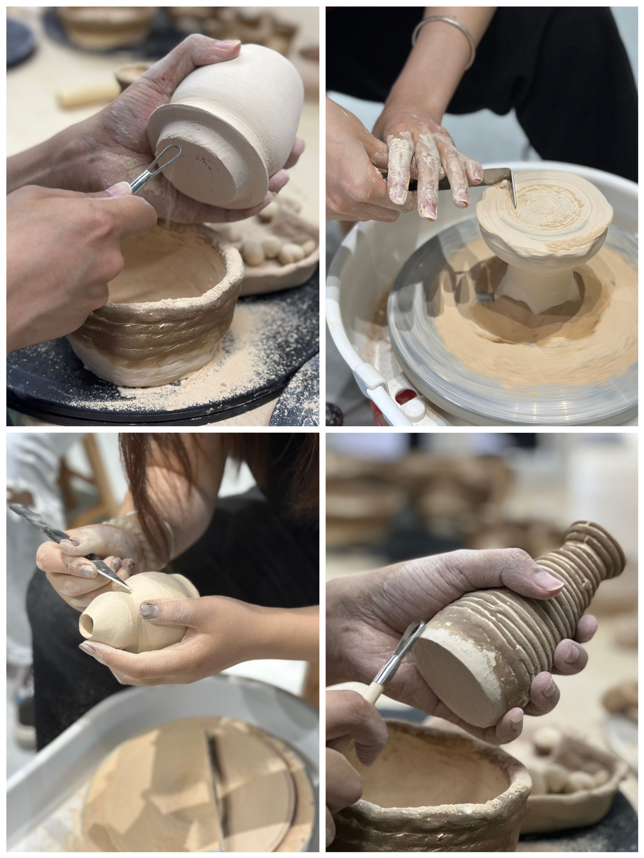 每一件精心雕刻的修整胚,都是同学们成长蜕变的见证。从最初揉泥时的生涩笨拙,到如今拉坯时的从容自信;从修胚时的小心翼翼,到创意表达的挥洒自如,这些作品不仅展现了技艺的精进,更承载着同学们对传统工艺的深刻理解。在张姣老师专业而富有启发性的指导下,同学们将传统技法与现代创意完美融合,让每一件作品都闪耀着独特的艺术光芒。这些成果的取得,对同学们而言是一次审美能力与工艺塑造能力的全面提升;对横山国瓷研学工坊来说,是教学体系有效性的生动印证。