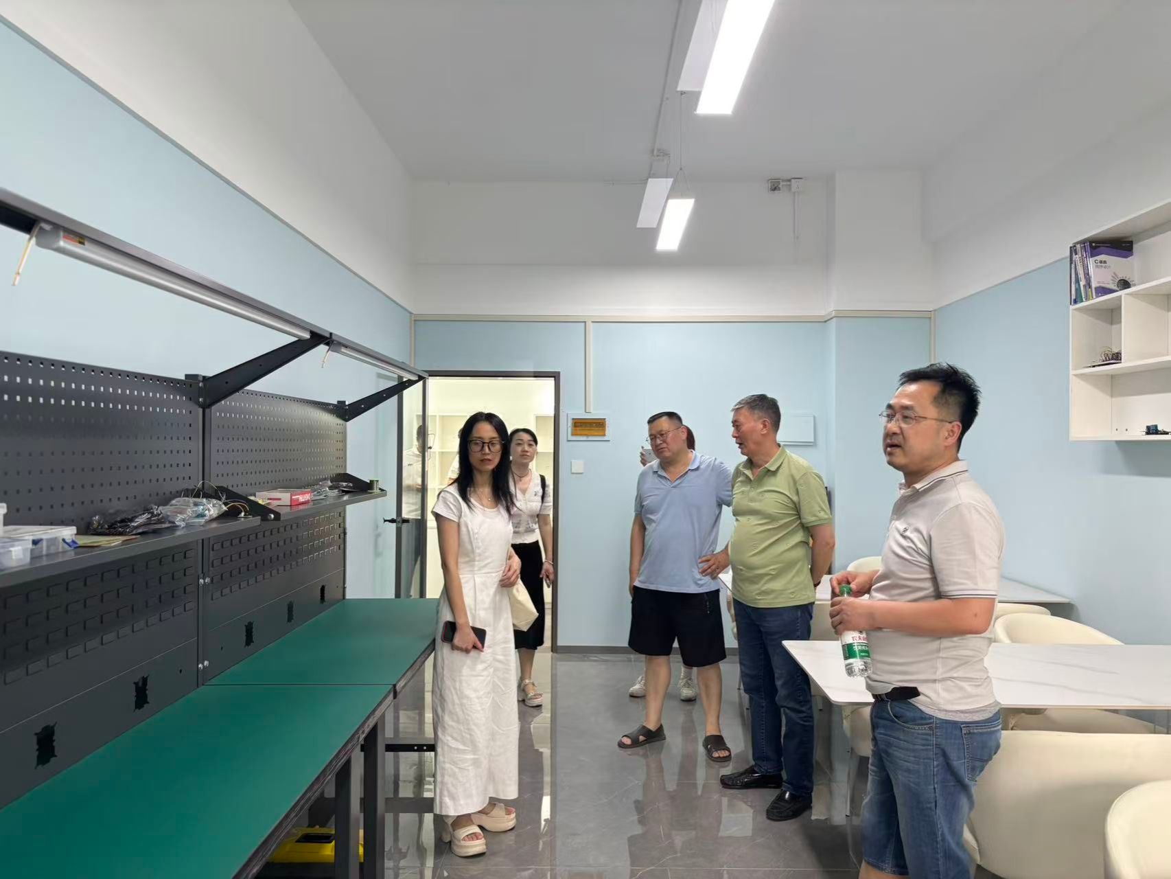 最后,李院长带着杨波教授、雷一鸣总经理以及老师们走进电子技术创新中心。新一代信息技术教研室作为学院与成都信息工程大学携手打造的成果,未来将在这个充满创新活力的中心里,全面开启人才共育的新征程,为行业输送源源不断的优质人才。