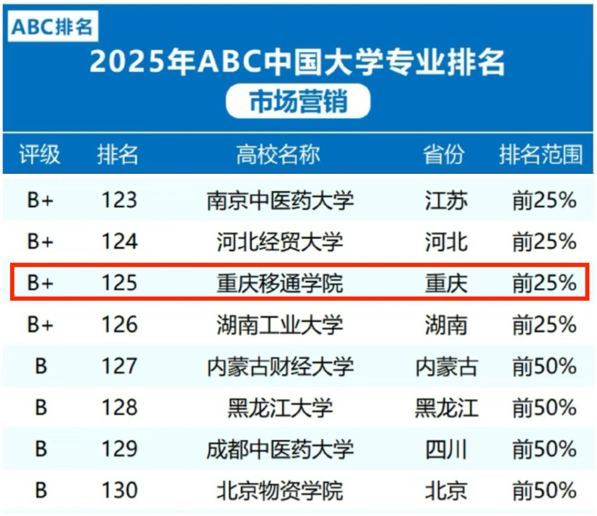 5月21月,中国大学排行榜(CNUR)发布2025年全国所有本科高校(公办民办共同参与)的专业排名,重庆移通学院淬炼商学院市场营销专业表现优异,在全国高校中位列第125名。值得关注的是,该专业是前150名高校中唯一的民办高校市场营销专业。