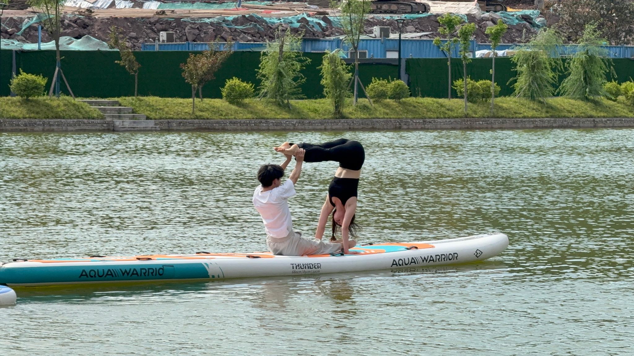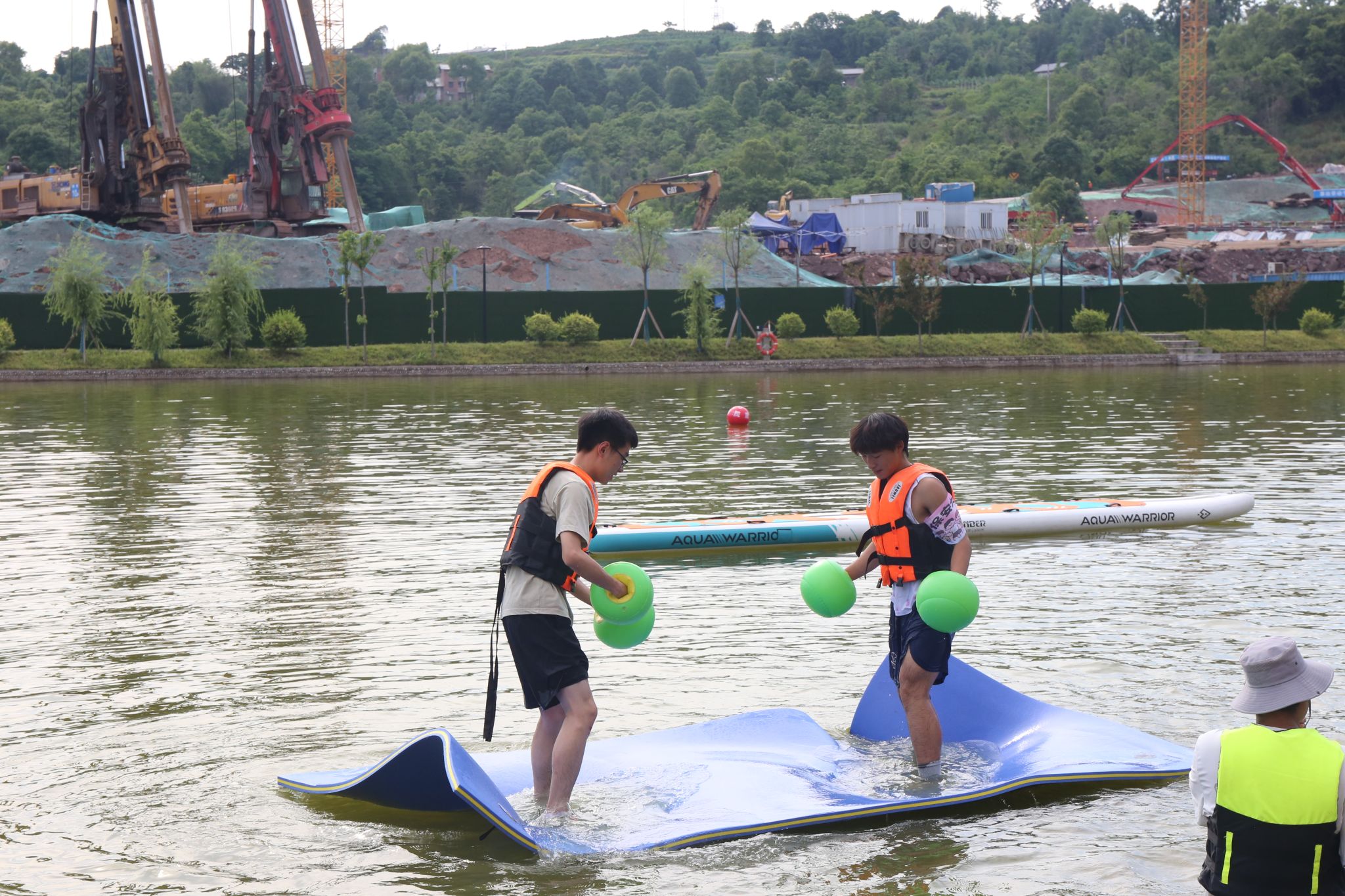 校瑜伽队活力开场舞,拉开了本次挑战赛的帷幕。首轮 “全面战争” 项目中,参赛选手佩戴充气手套站上浮板,以推落对手为目标展开攻防。选手们在摇晃的浮毯上稳扎马步,灵活闪躲间精准发力,水花飞溅声与观众欢呼声交织,现场气氛迅速升温。随后进行的 “激流追逐” 中,赛道由浆板串联成环线,选手需在顺时针追逐中触碰前方选手任意部位即为追逐成功,在一次次的你追我加速的状态中,紧张节奏点燃全场热情。