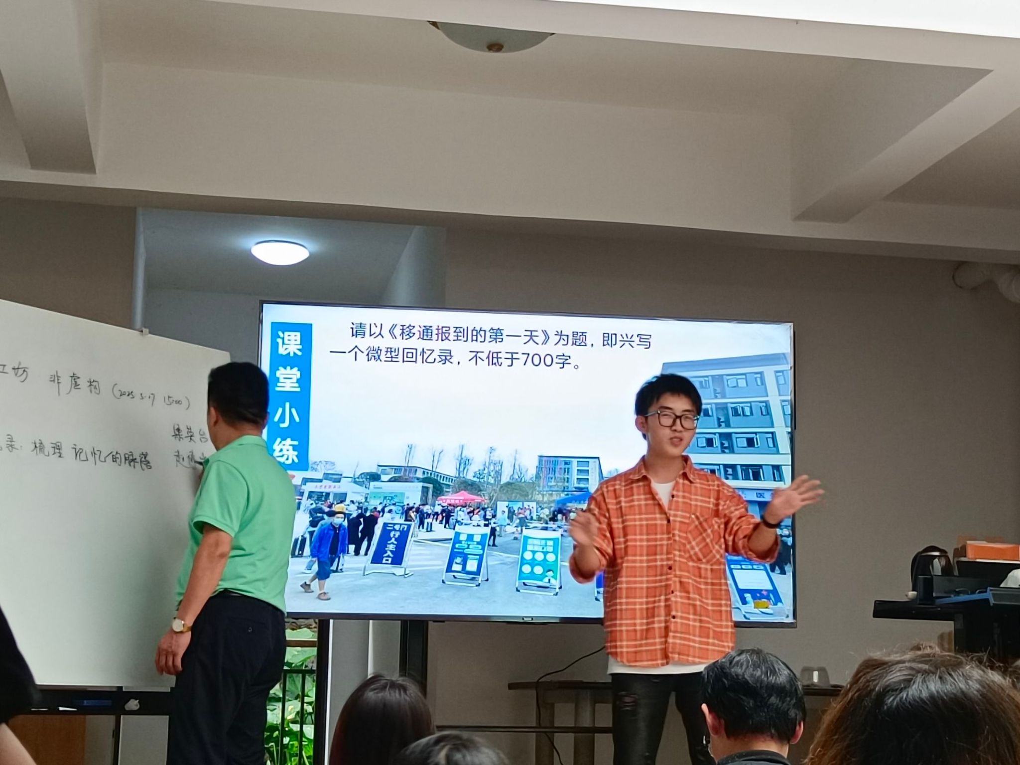 下午,王恒绩老师开启了“书写记忆的脉络——回忆录”教学篇章,点出了非虚构写作让人着迷的地方,正是因为它的真实性。这看似比虚构写作缺少更多的创作自由,但它逼着写作者卖力地挖掘事实、搜集信息,非虚构写作的创造性正蕴含在此间。王老师以“移通报到的第一天”为引,带领同学们纷纷陷入回忆,踊跃分享自己初入大学时的新奇、懵懂与憧憬。梁英台同学回忆起第一次离开家乡河南,在平原长大的她第一次学着坐高铁,迈出自己成长的第一步,重庆这个山城对梁同学充满了惊喜,同时也有对陌生环境的好奇与不安;赵博凯同学从自己独特选大学的方法讲起,谈到从祖国的西北方——内蒙古来到了祖国的西南方,从一路上遇到的人关于重庆的描述,到亲眼见识到的重庆的不同。同学们的发言引起一个又一个同学的共鸣,现场气氛热烈非凡,一个个故事生动鲜活,仿佛将大家带回到了刚踏入大学校门的那一刻。