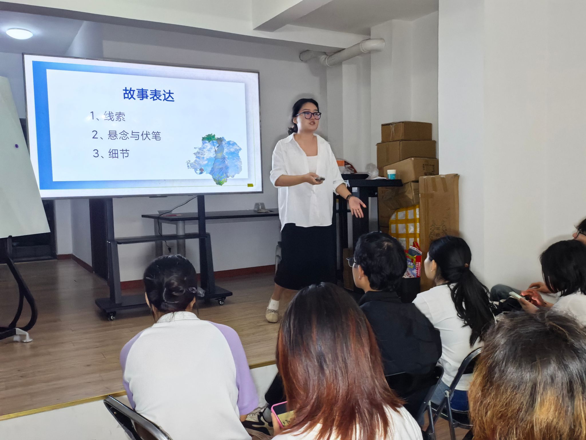 晚上,非虚构工坊殷文佳老师带领同学们走进了剧本杀《seven院》的奇妙世界。在剧本杀的创新教学方式中淋漓尽致地将故事表达中的线索、悬念、伏笔、细节挥洒出来。同学们划分出伊人组、飘飘组、奈奈组、朋克组和饼干组分别扮演不同的角色,在错综复杂的剧情中深入思考、积极推理。剧本让同学们深刻理解悬念设置的方法:人物身份悬念法、危险悬念法、未知悬念法、任务挑战悬念法。现场气氛紧张而热烈,大家在角色扮演中体验着不同的人生,锻炼了团队协作和逻辑思维能力。这种寓教于乐的方式,让大家在轻松愉快的氛围中提升了创作与协作能力。