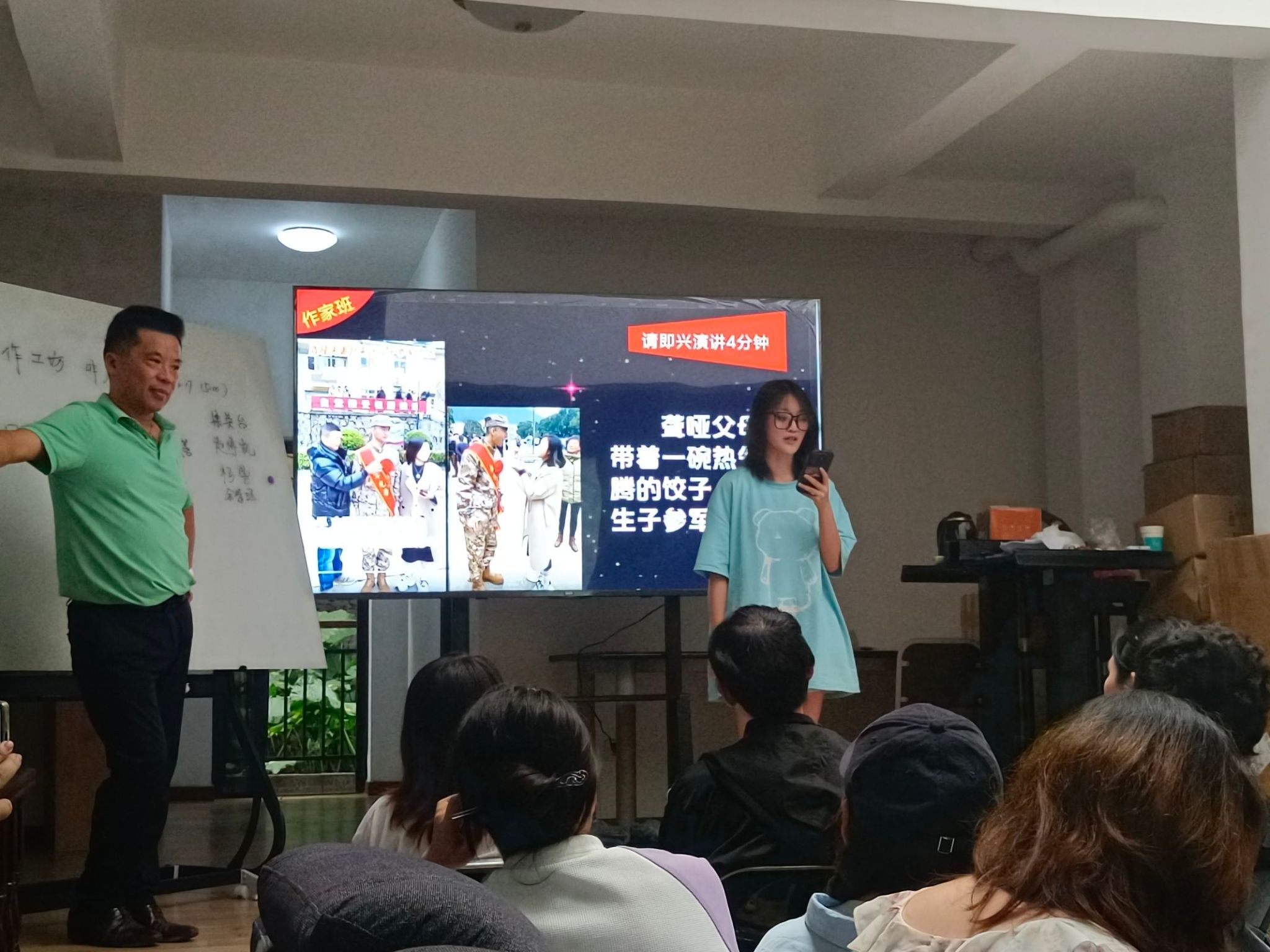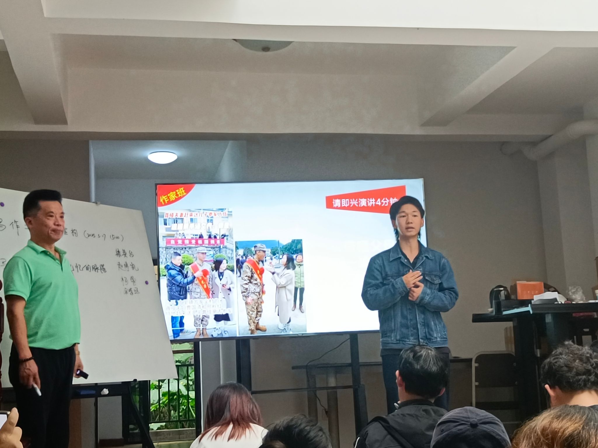 随后的看图即兴演讲环节,王老师展示了聋哑父母带着一碗热气腾腾的饺子,送独生子参军的画面。王老师提醒同学们可合理借助AI辅助构思,主要目的是充分锻炼同学们的口头表达能力与应变能力,与AI辅助工具结合的课堂也是对未来教学趋势的新探索。同学们跃跃欲试,一个又一个迅速组织语言,展开演讲,在挑战中不断突破自我。随后,王老师引用自己曾写过的关于《亮剑》电视剧李云龙的原型——王近山的回忆录,用经典来为大家诠释回忆录的核心要义。