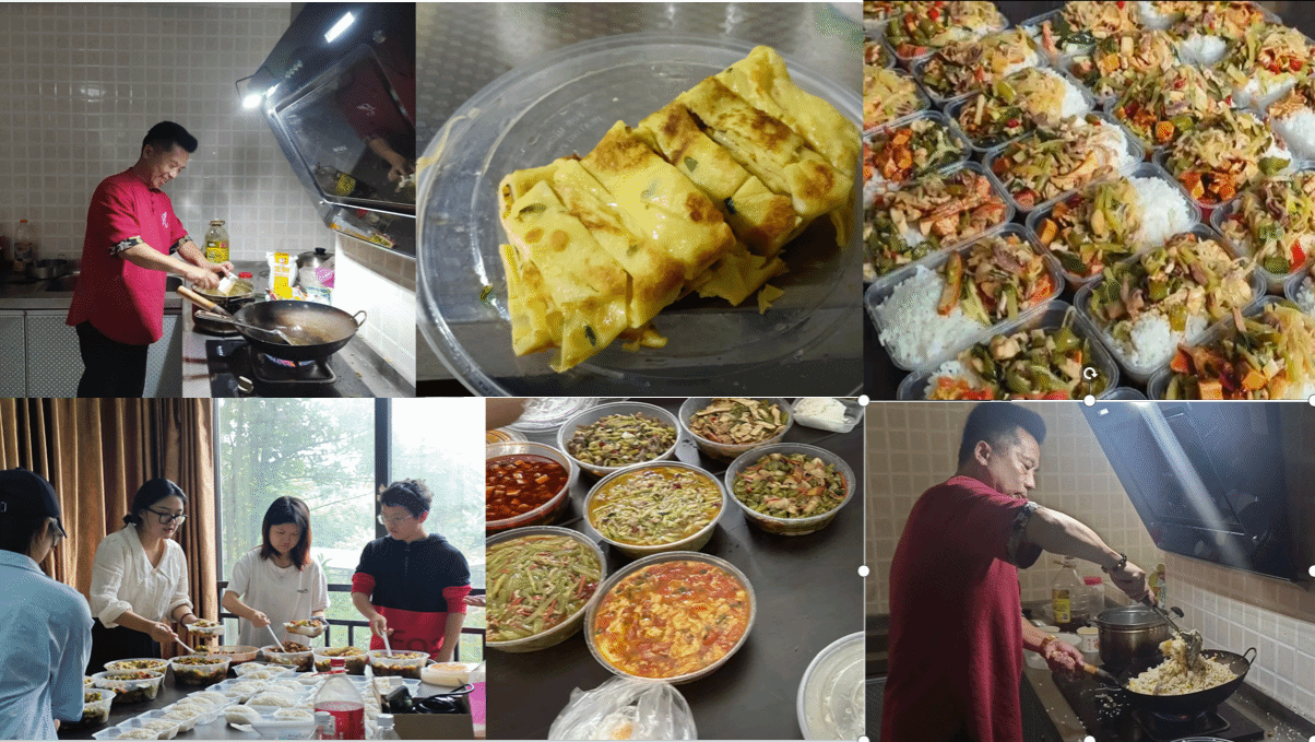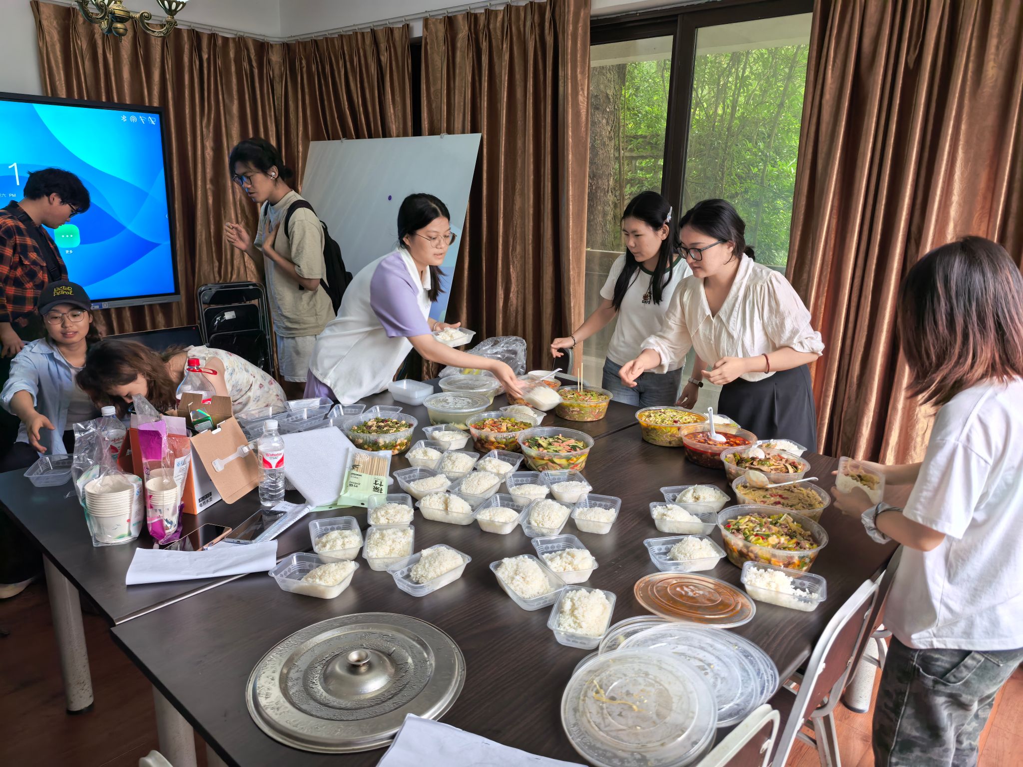5月16日晚,参与活动的成员们抵达了半山书院“小泉森林海”别墅区。当车门打开,大家瞬间被这里静谧而美好的氛围所“俘获”。青山环抱,绿树成荫,柔和的晚风吹拂着,仿佛在轻声诉说着这里的宁静与安逸。小说工坊的马静老师感叹:“真是泡了一次森林氧吧!”稍作安顿后,平日里在讲台上侃侃而谈的非虚构工坊导师王恒绩系上围裙,走进厨房,亲自为大家准备美食。不一会儿,香气四溢的蛋炒饭和烙饼新鲜出炉。在温馨的灯光下,大家围坐在一起,享用着美食,一天的舟车劳顿和疲惫都在这袅袅的烟火气中渐渐消散。随后,大家回房休息,为接下来的学习和交流养精蓄锐。