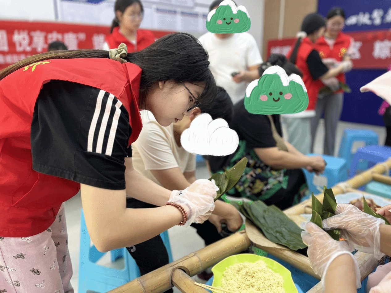 随着参与者的陆续到来,活动正式拉开帷幕。志愿者们与残障人士一对一结伴,共同参与到包粽子、包青团的体验中。在制作过程中,志愿者们耐心指导,鼓励残障人士大胆尝试,从最初的生疏到逐渐熟练,每个人都沉浸在这一传统技艺的乐趣中。特别是在“艾香粽意,同心共制”环节,残障人士在志愿者的协助下,不仅学会了粽子的制作方法,还发挥创意,制作出形状各异、独具特色的粽子。而在“青芒叠翠,团意暖心”环节,青团的制作同样激发了大家的参与热情,翠绿的青团包裹着丰富的馅料,寓意着团圆与美好。这不仅帮助残障人士学习了传统美食制作技能,还增强了他们的动手能力和生活自信心。