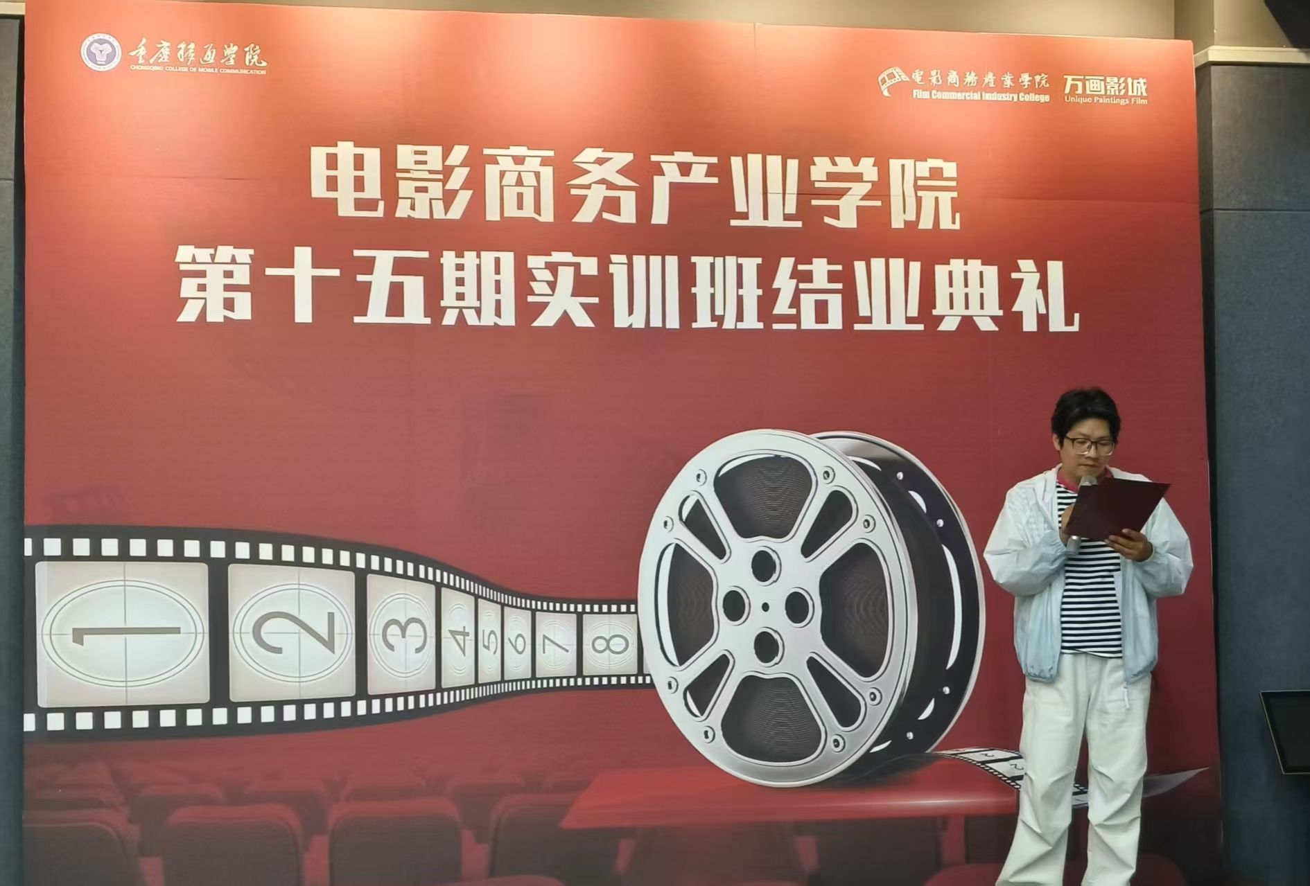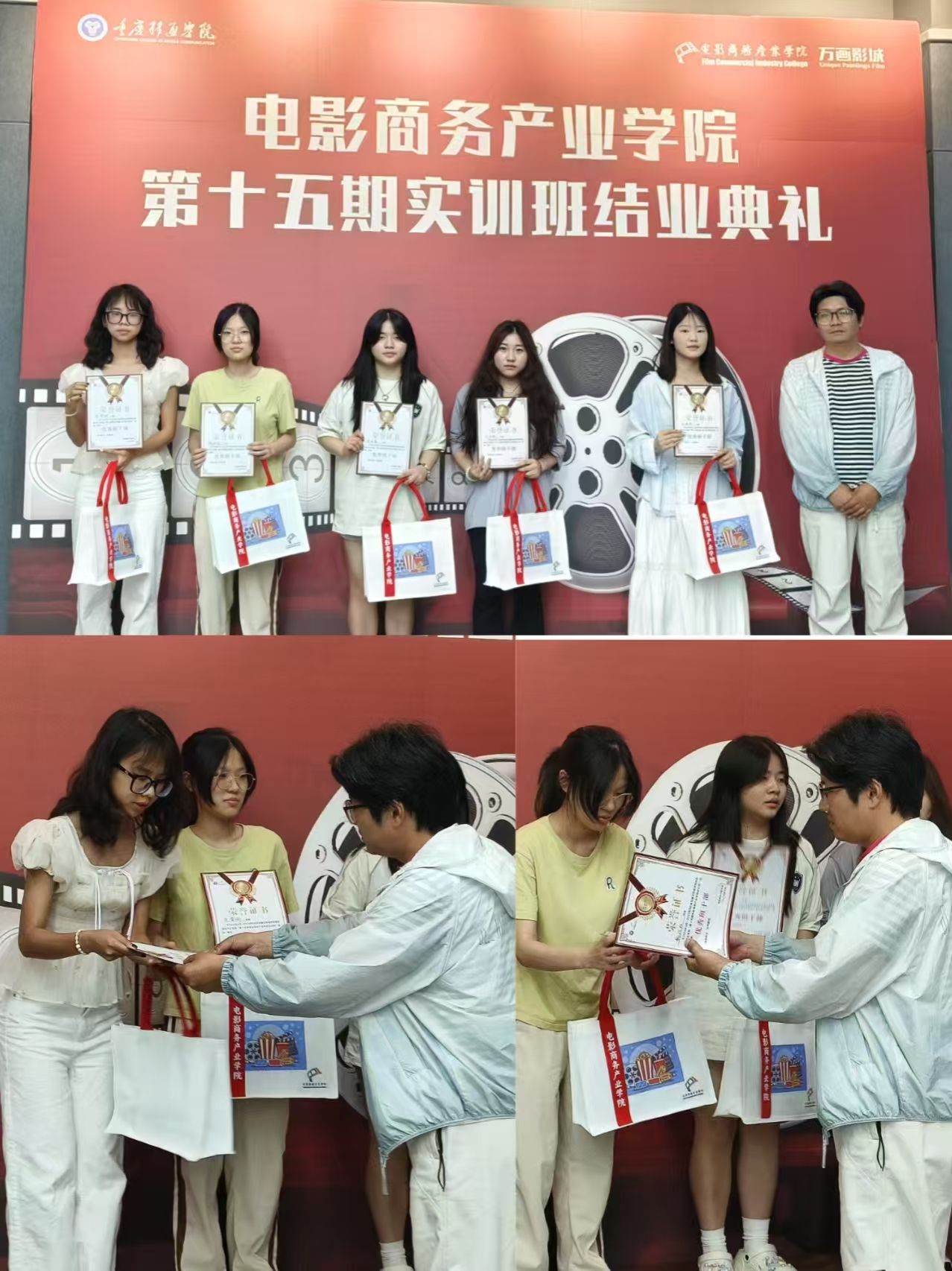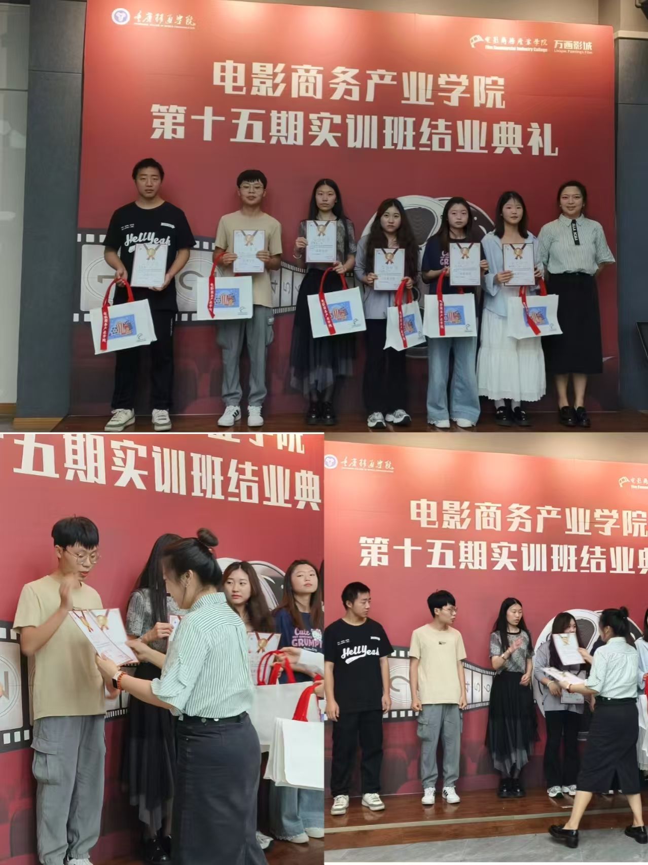张老师发表了热情洋溢的致辞。她充分肯定了实训班学员们在学习期间的努力与坚持,对大家专业能力的提升表示认可。感慨地说:“看到同学们从刚入学时的懵懂,到如今能够自信地应对各种专业挑战,我深感欣慰。”她还鼓励学员们在未来的道路上,继续保持对电影商务产业的热爱,不断学习,勇于创新,为推动行业发展添砖加瓦。致辞结束后,张老师为优秀学员颁发了荣誉证书,激励他们在未来继续发光发热。