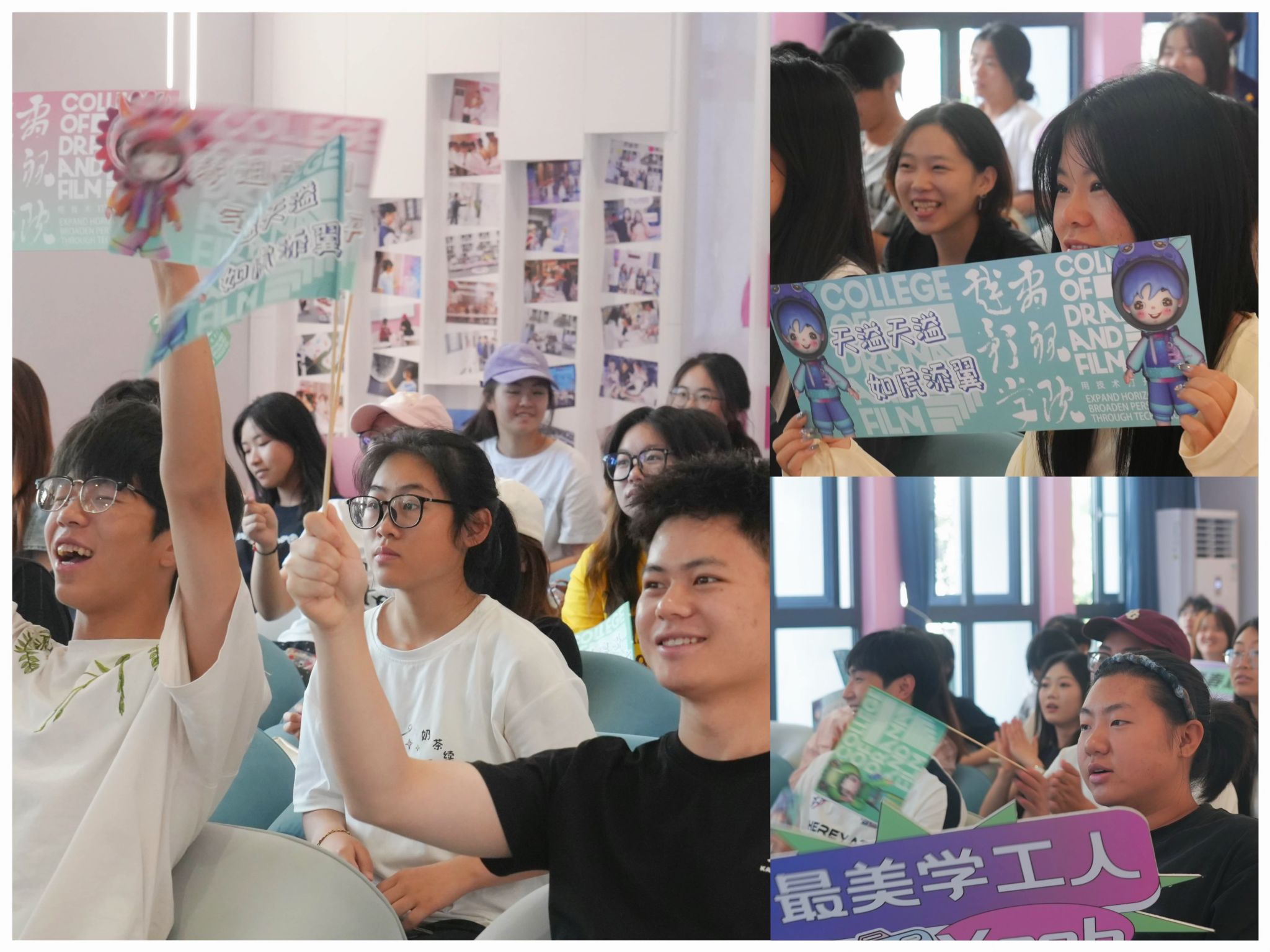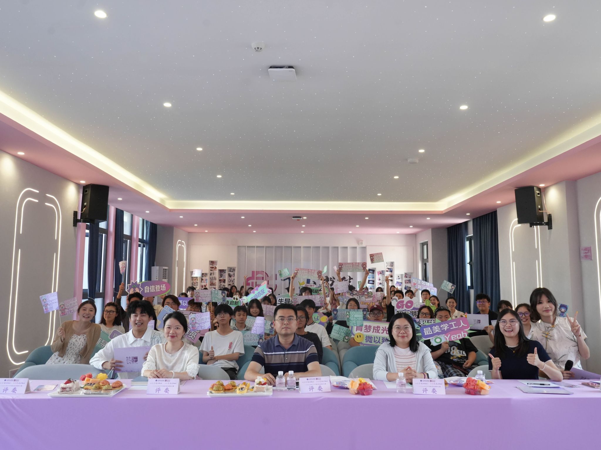 比赛现场氛围热烈,同学们热情高涨,以极具创意的方式为辅导员老师们加油助威。专属应援口号此起彼伏 ——“天溢天溢,才华横溢;人生易如反掌,梦姐carry全场;西康西康,气势如钢......”一句句充满巧思的呐喊,既嵌入辅导员的名字,又融合个性特质,化作跳动的音符,谱写出师生间的温情乐章。同学们挥舞着定制kt板,眼神中闪烁着期待与信任的光芒。那一张张因激动而泛红的脸庞,与赛场上辅导员们专注应答的身影交相辉映,共同勾勒出“亦师亦友、双向奔赴、相互欣赏、彼此成就的动人画面。