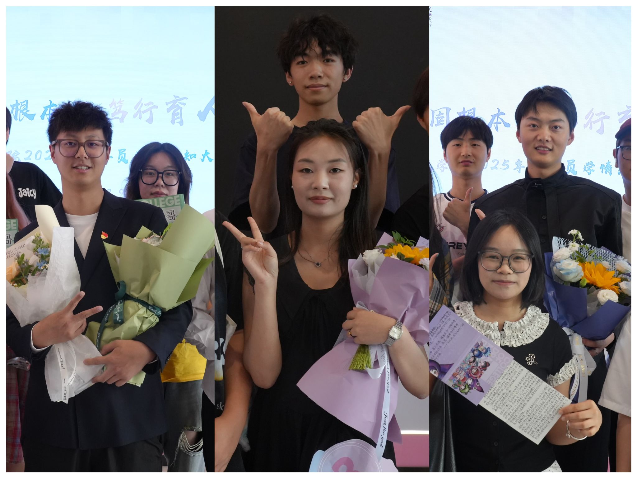 从照片到信息,老师们通过日常管理了解学生、走进学生,当彼此的距离近了,心靠拢了,问题也就迎刃而解了。大赛最后,辅导员们育人故事里的主角们纷纷来到现场,他们手捧鲜花,用热烈的掌声为自己的辅导员加油助威。那些平时藏在心底的悄悄话,随着卡片的传递,与鲜花的芬芳一同送到老师手中。更有戏娃勇敢起身,向在场观众讲述他们与辅导员之间最记忆深刻的故事。当关爱与感恩形成闭环,教育的温度便在这场真诚的对话中悄然生长,最终化作滋养心灵的永恒力量,在每个人的心中绽放出最美丽的花朵。